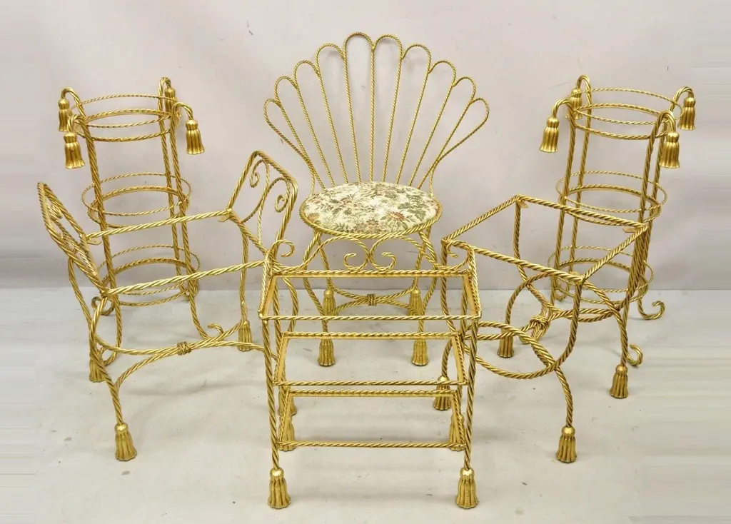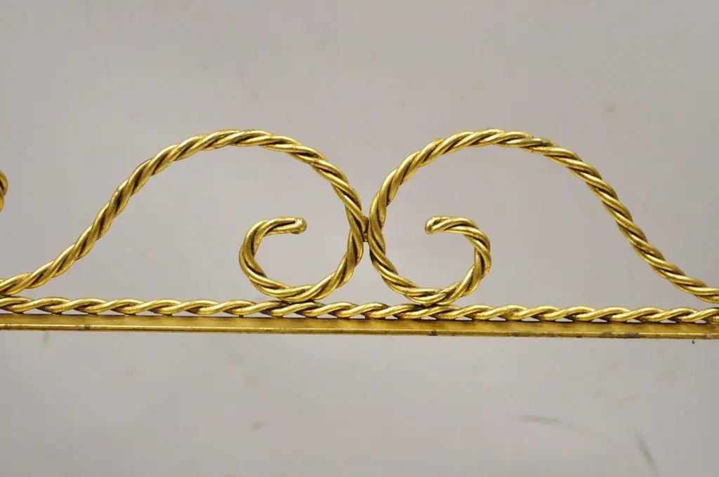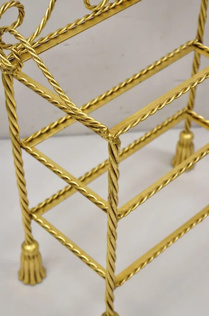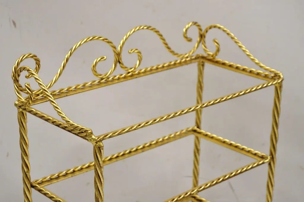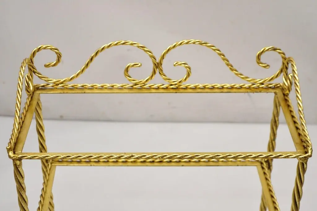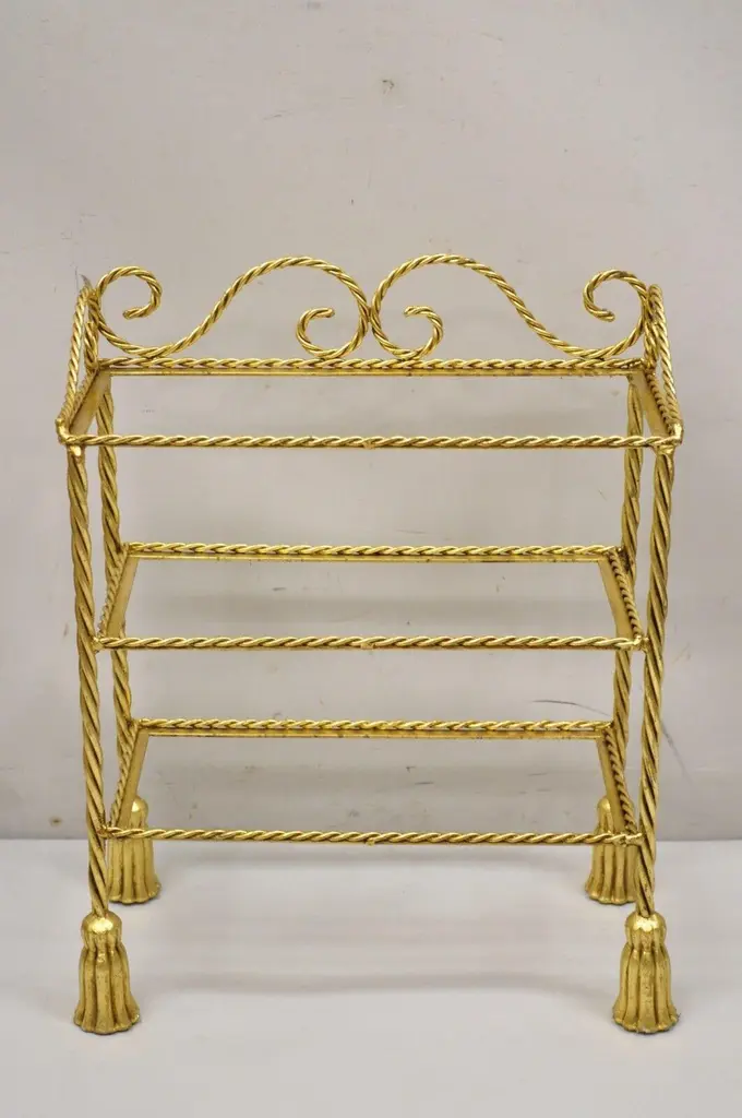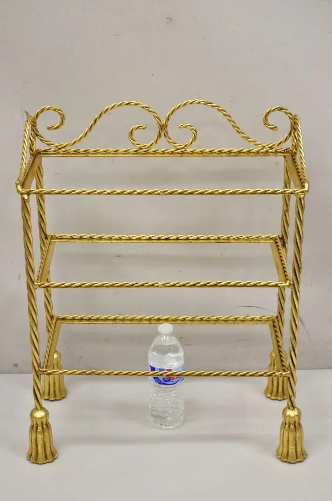 Vintage Italian Hollywood Regency Gold Gilt Iron 3 Tier Shelf Small Curio Display stand (B). Item featured is a nice small Size, 3 tiers, (no glass for shelves), rope design frame, tassel form feet, wrought iron construction, quality Italian craftsmanship, great style and form, multiple quantity available. Price is per piece. Other Italian pieces available as pictured, circa Mid-20th century. Measurements: 23.5" H x 19" W x 10" D (at base).Multiple quantity available. Price is per piece.