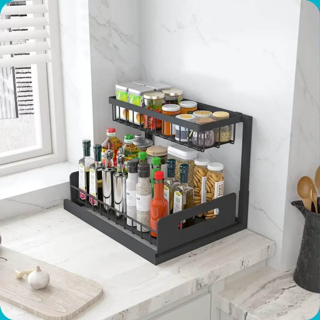 Looking for a practical solution to organize your sink area? Our under sink organizer is the answer! It features a unique L - shaped design that maximizes vertical space, leaving room for plumbing and tall bottles. The sliding drawer with handles allows for easy access to stored items. Installation is a breeze, requiring no tools and using suction cups and tapes for stability. Made of high - quality steel, it can bear up to 50 lbs and is rust - proof with a baking paint finish. The grid design prevents water accumulation, and the removable pads keep objects in place. This multi - purpose organizer is suitable for kitchens, bathrooms, and laundry rooms. It can be used to store toiletries, spices, or other items, bringing order to your daily life. Remember to take measurements before ordering to ensure it meets your needs.