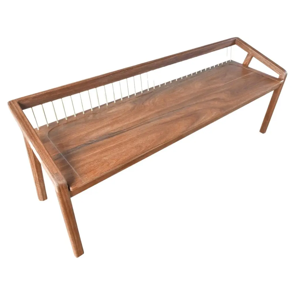 Sculptural shelf by French modernist designer, Jacques Adnet. A simple yet elegant design with a thick wooden shelf held together by a metal frame. Leather divider right in the middle with signature Adnet contrast stitching. Metal completely wrapped in twine giving the piece nice contrast. Great for books or small plants. 2 available. Priced individually. Good vintage condition.