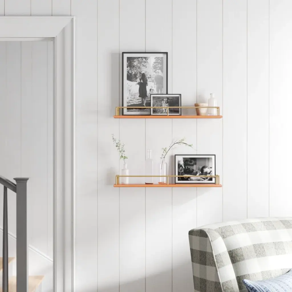 Upgrade your walls with this set of two floating shelves, perfect for showcasing your favorite books, plants, or decor. Crafted from solid wood and metal, these rectangle shelves offer a touch of industrial flair while providing ample space for your belongings. The natural wood grain color variation adds character and warmth to your space. Designed for residential use, these made-to-order shelves are easy to install and blend seamlessly with your existing style. Say hello to a fresh and organized look!