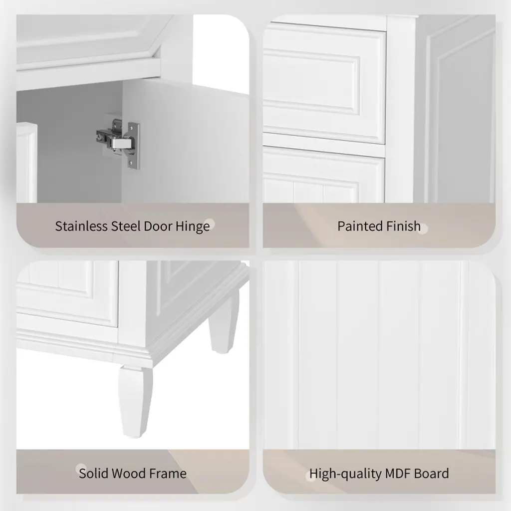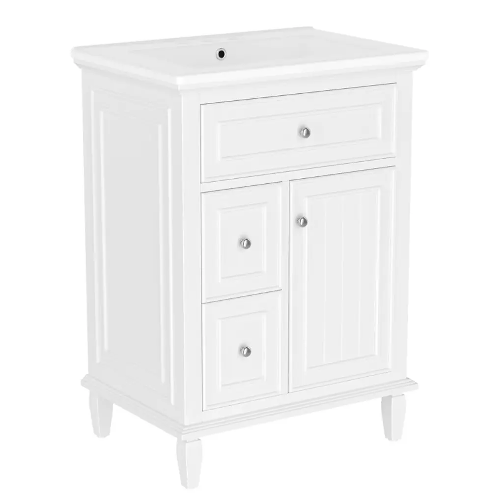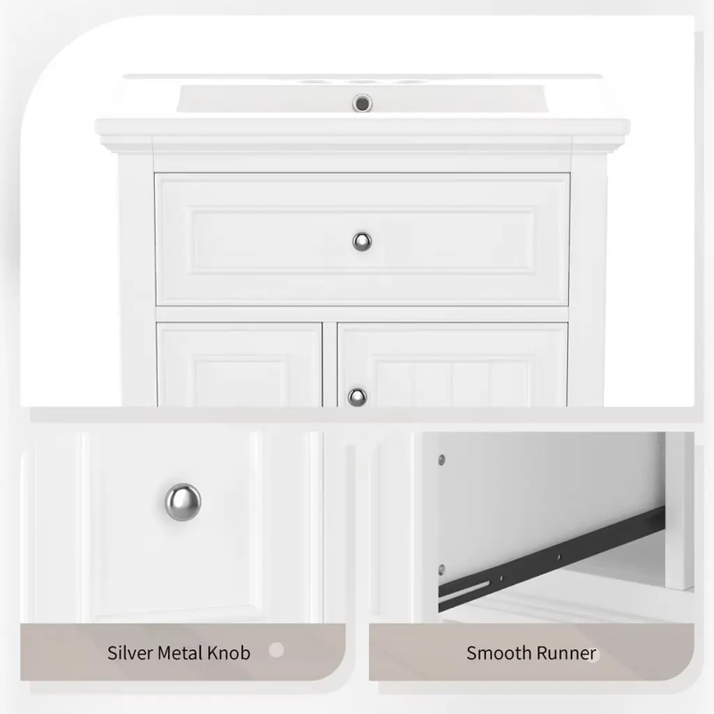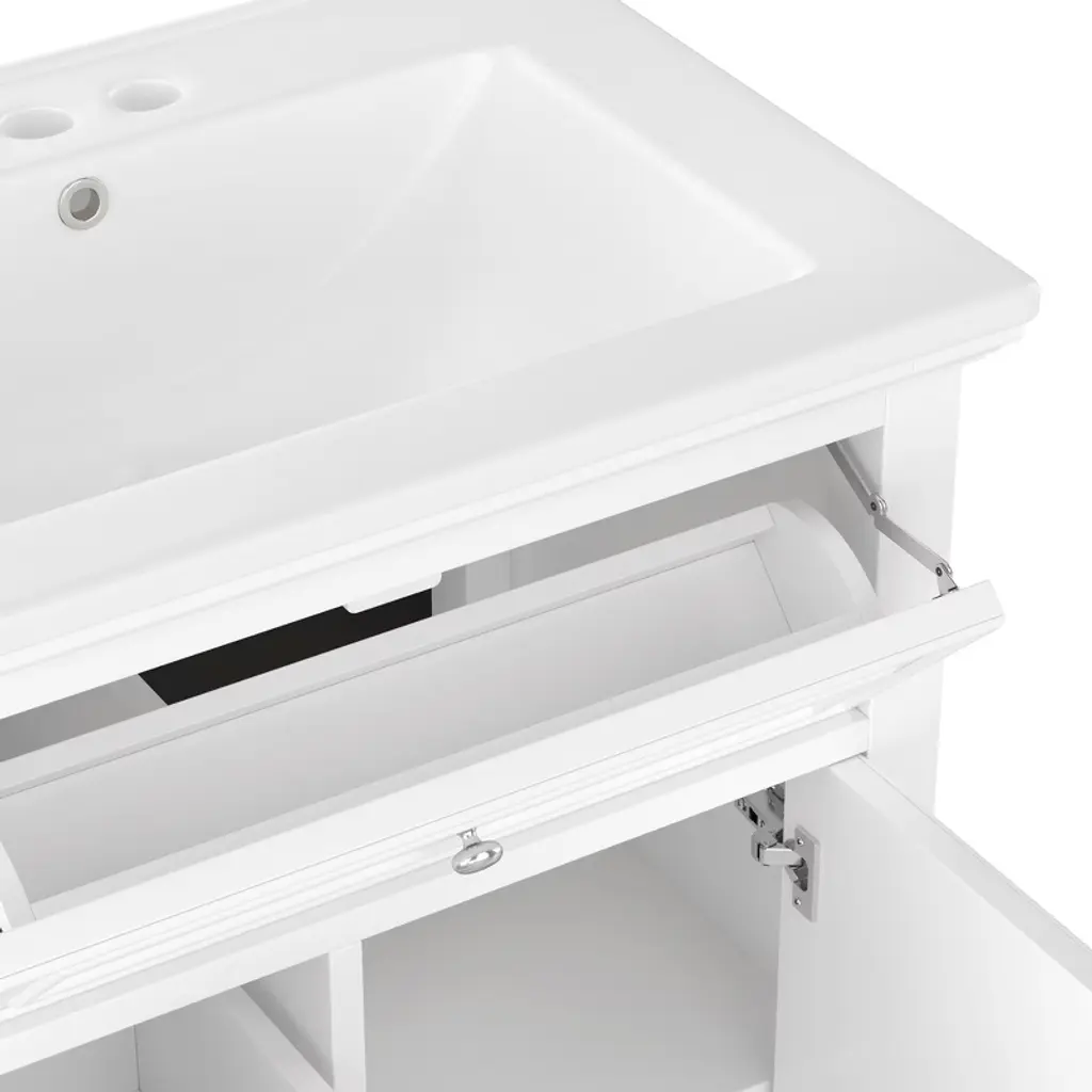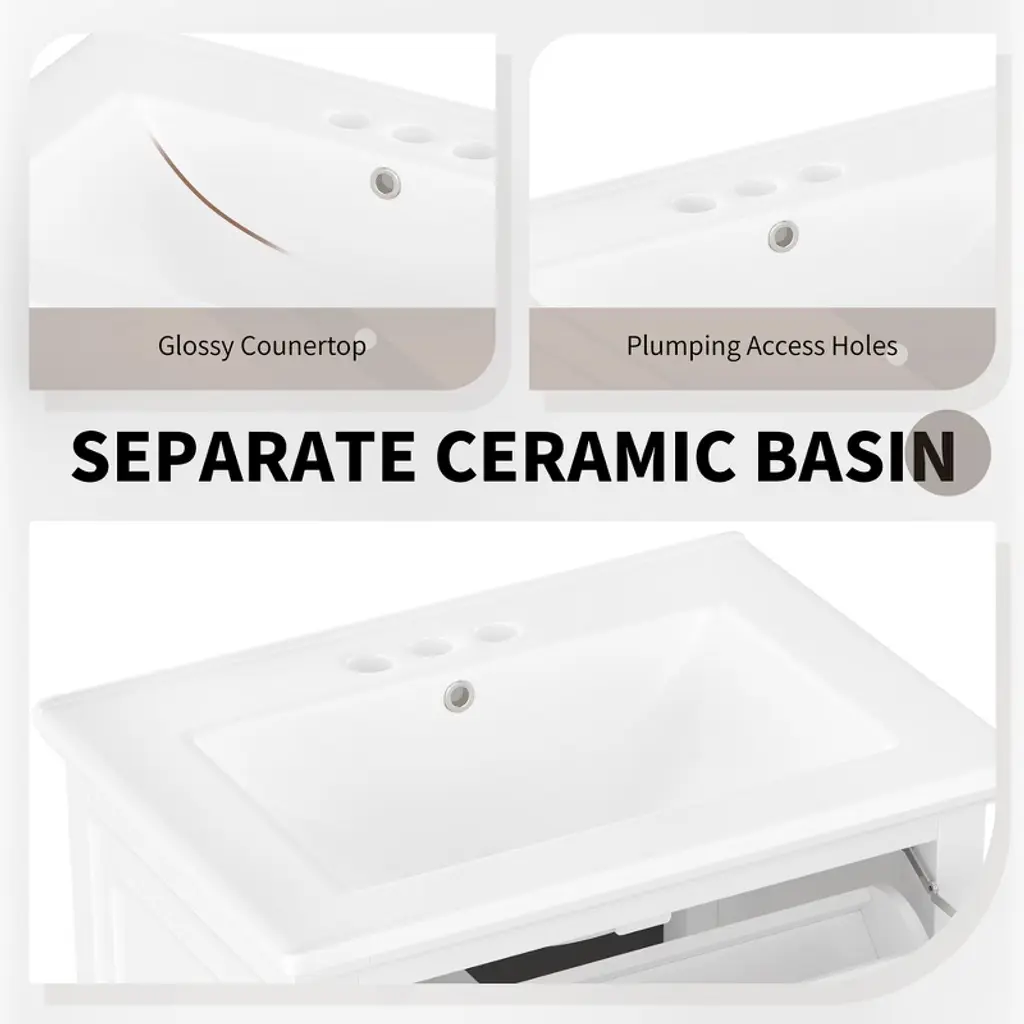 This bathroom vanity combines practicality and durability, starting with a ceramic sink featuring a built-in overflow (with a stylish metal ring) to prevent spills, plus three pre-drilled holes for easy 4" faucet installation (faucet not included). The smooth ceramic surface resists water stains and cleans effortlessly, ideal for busy households, while the sturdy solid wood frame and high-quality MDF boards ensure long-lasting strength—perfect for humid bathroom environments. Storage is abundant and versatile: a cabinet with a door, a lift-up flip drawer (with an adjustable shelf), and two side drawers keep essentials like soap, towels, and shampoo organized, dust-free, and dry. With clear assembly instructions and all hardware included, setup is hassle-free, making this vanity a functional, low-maintenance addition that elevates both organization and style in your bathroom.