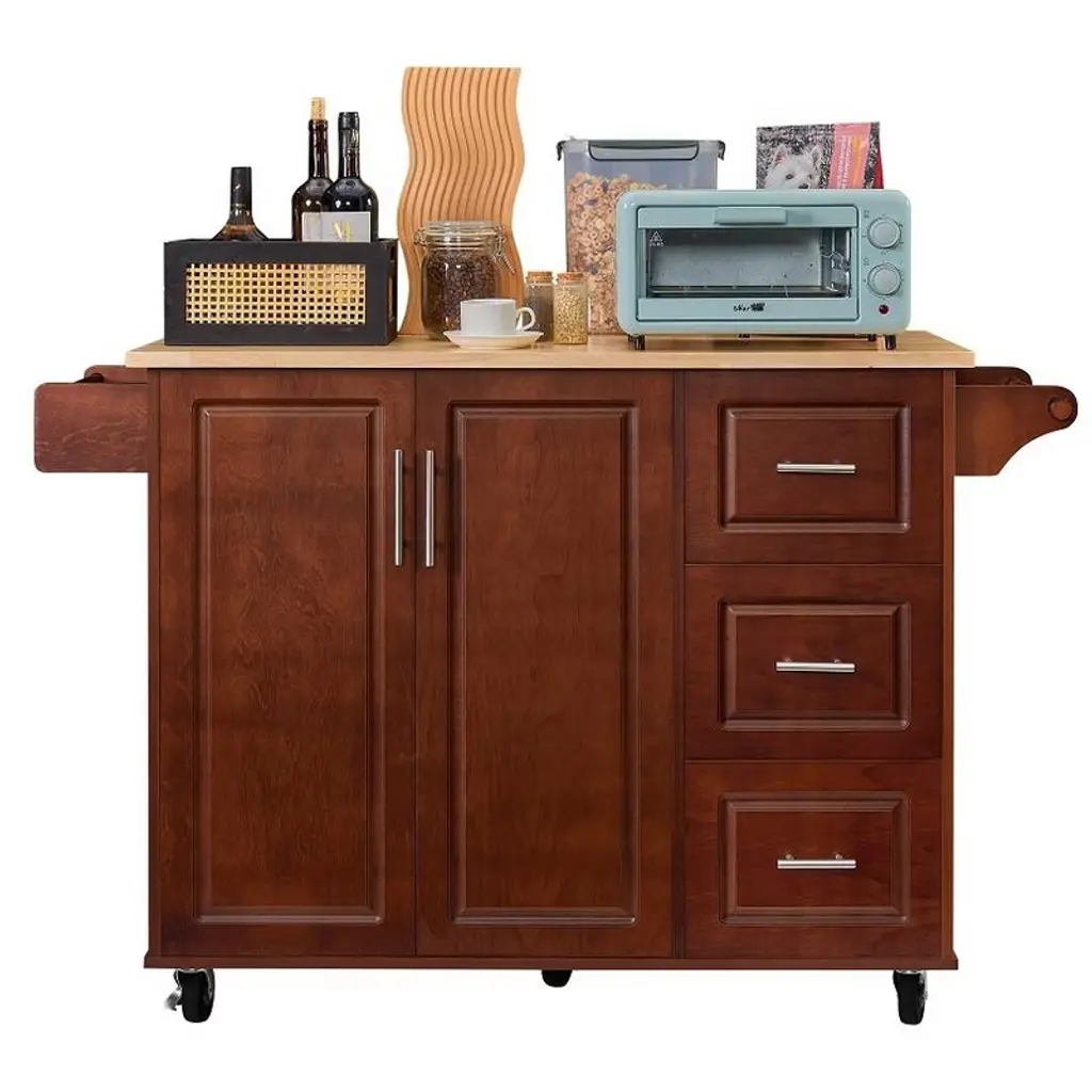 This classic and elegant kitchen island is made of sturdy and environmentally friendly MDF, with a painted exterior and an oak veneer tabletop. The raised texture and gold handles add a sense of luxury. It comes with 1 large drawer and 4 small drawers for easy classification and storage. There are towel racks and spice racks on both sides, and the height-adjustable shelves inside can accommodate items of different sizes. The drop-down board on the top can be expanded or folded according to needs, and can be flexibly adapted to the space. The bottom is equipped with five 360° universal wheels, two of which can be locked for easy movement or fixation. It is both beautiful and practical, and is an ideal choice for the kitchen.