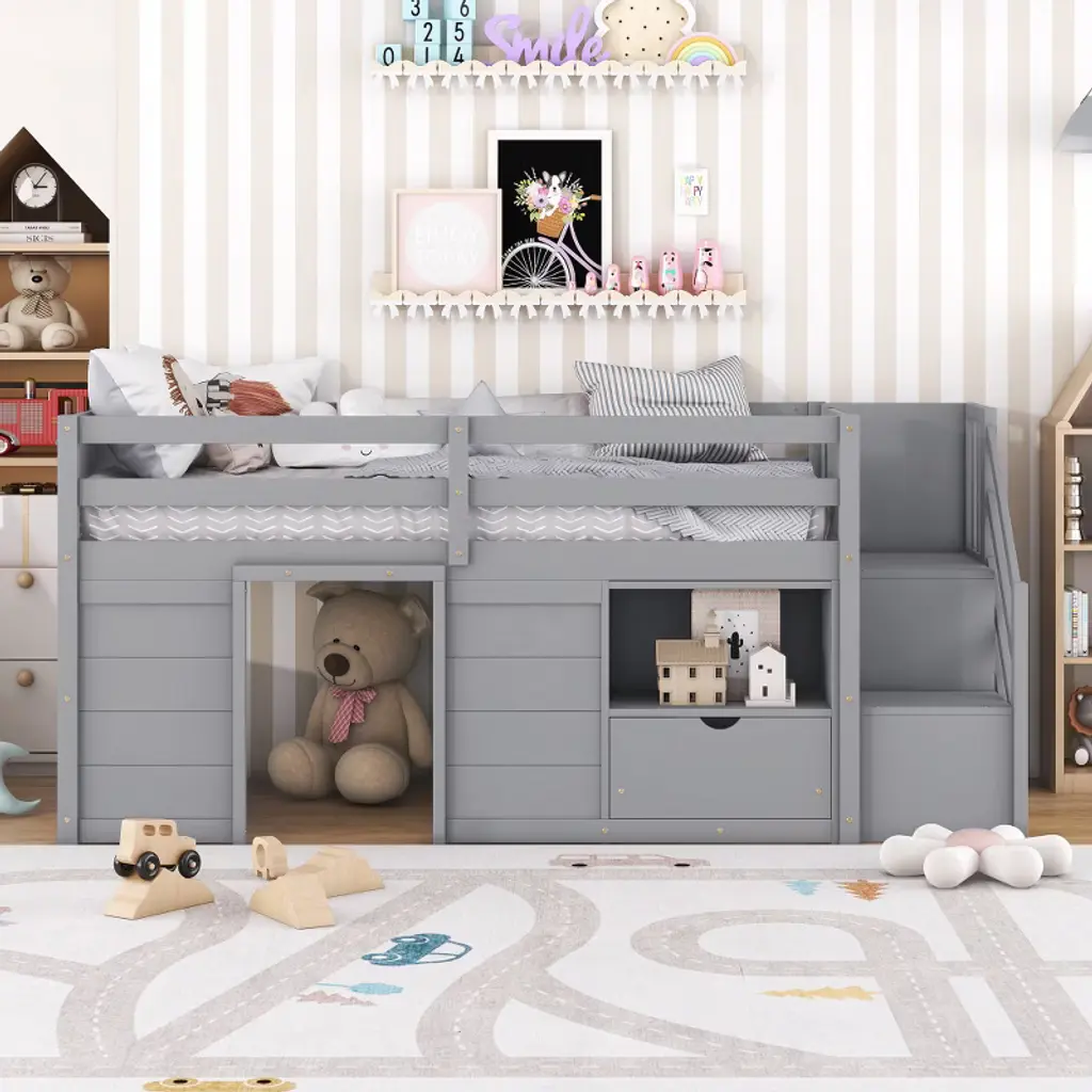 Jujabu Solid Wood Twin Size Low Loft Bed With Staircase, Drawer, And Storage Shelf, Gray