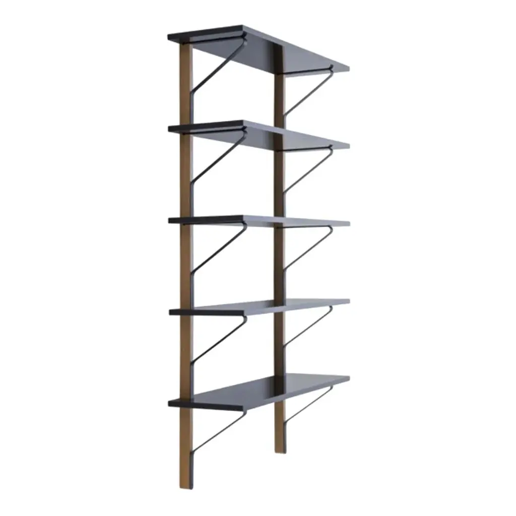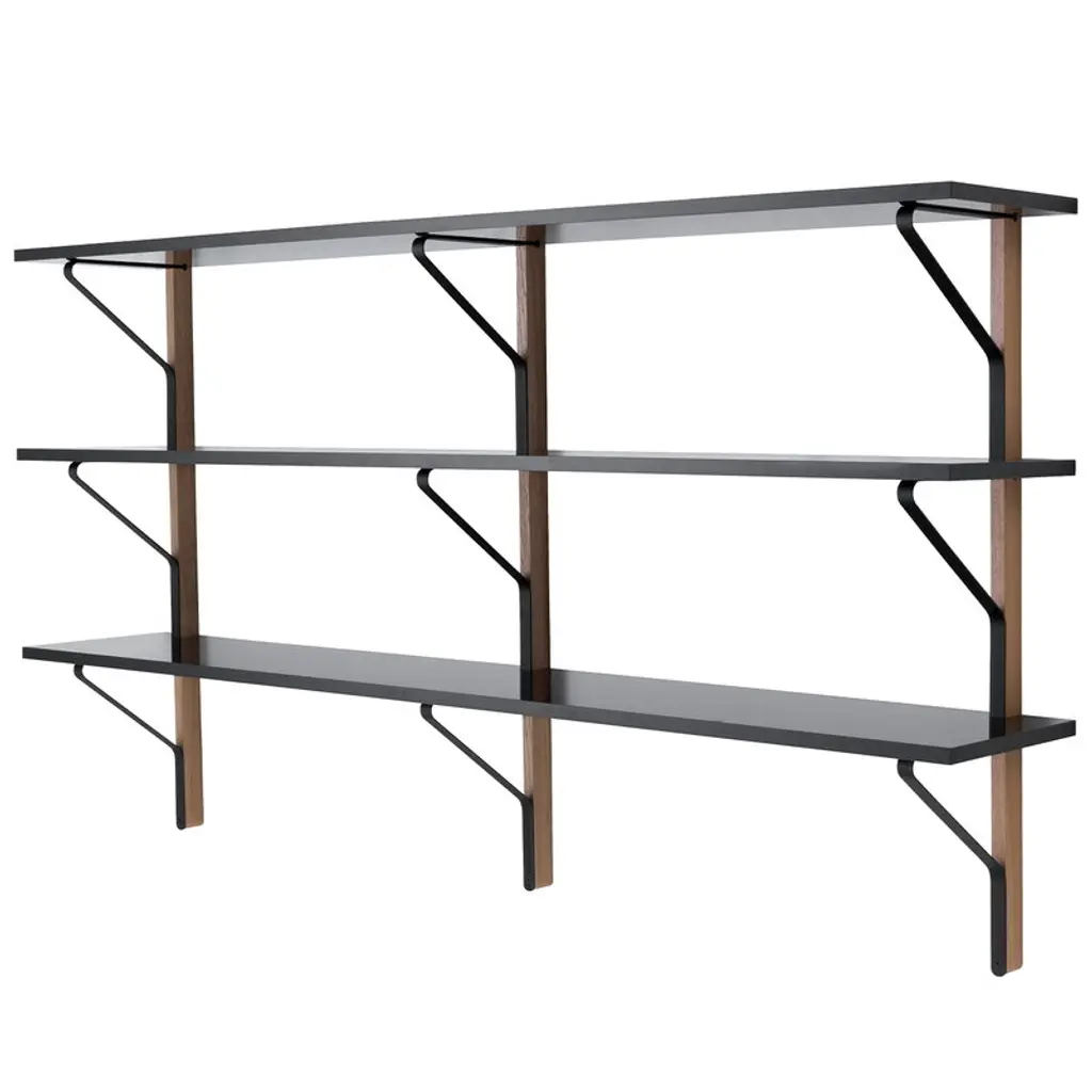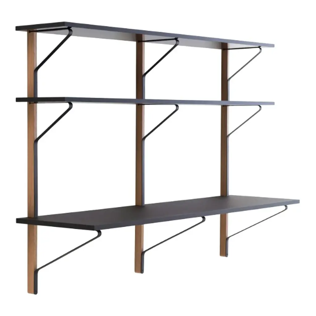 These wall-mounted shelves come complete with a desk, offering a compact home office unit. Combining natural solid oak wall brackets with the simple bent steel band that characterises the Kaari collection, the shelves have a glossy melamine surface, while the desk is finished in linoleum for a comfortable working surface. Added width offers room for co-working or to spread out papers, plans, and files.Wall brackets: Solid oakBraces: Flat rolled steelShelf surface: Melamin, LinoleumShelf edge-band: ABSKaari Wall Shelf with Desk is available in two widths and with melamin and linoleum surfaces.