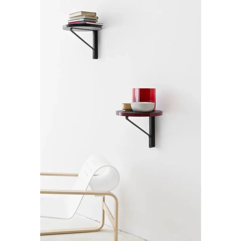 Artek’s Kaari shelf REB 007 features a blue linoleum panel with a glossy red ABS edge. Its diameter is 13.78 in (35 cm) and thickness 0.94 x 0 in (2,4 x cm. cm). The wall bracket is made of black powder coated steel and solid black stained oak with a protective varnish. The elegant Kaari collection was designed by Ronan and Erwan Bouroullec and launched at Stockholm Furniture Fair in 2015. As Alvar Aalto’s furniture was characterized by the L-leg, the Bouroullecs’ Kaari tables feature a unique leg system composed of vertical wood and bent steel. It became obvious during the design process that the legs could also be used to support wall-mounted objects such as shelves and consoles. The series has an attractive silhouette, created by the wing-shaped steel structure. Kaari combines the traditional materials of Artek in a new and fresh way. Invest in a future classic and preserve it for generations to come.