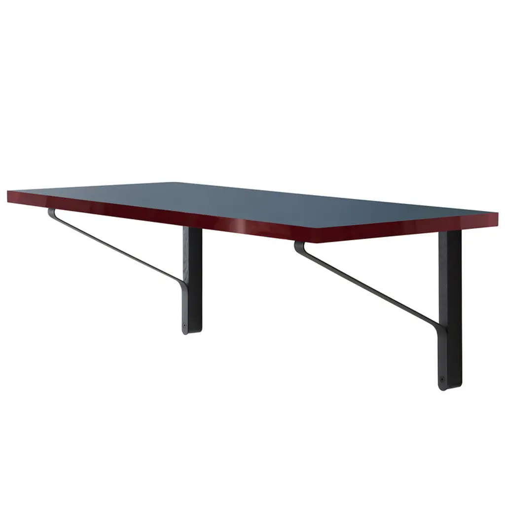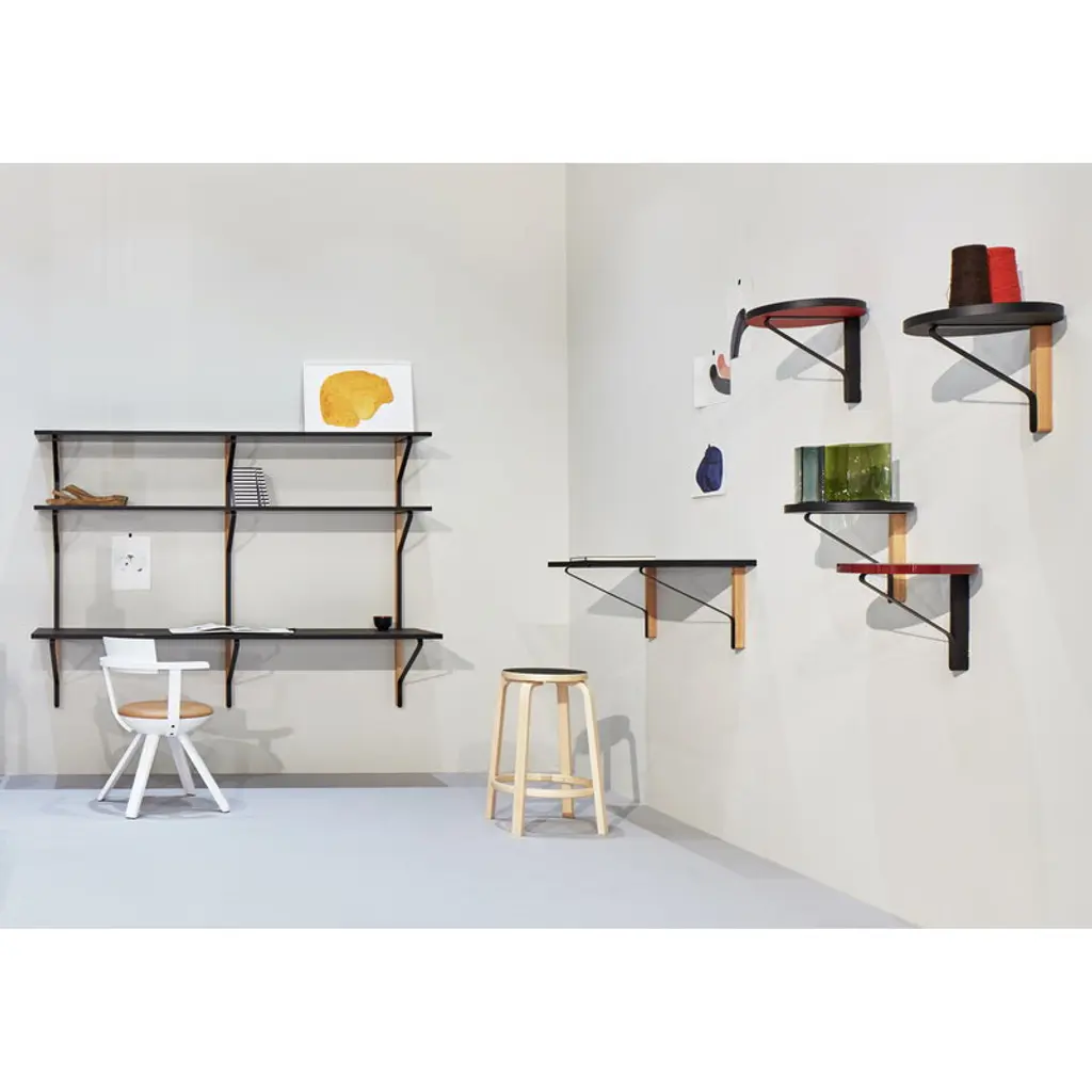 Artek’s Kaari shelf REB 007 features a red linoleum panel with a black ABS edge. Its diameter is 13.78 in (35 cm) and thickness 0.94 x 0 in (2,4 x cm. cm). The wall bracket is made of black powder coated steel and solid black stained oak with a protective varnish. The elegant Kaari collection was designed by Ronan and Erwan Bouroullec and launched at Stockholm Furniture Fair in 2015. As Alvar Aalto’s furniture was characterized by the L-leg, the Bouroullecs’ Kaari tables feature a unique leg system composed of vertical wood and bent steel. It became obvious during the design process that the legs could also be used to support wall-mounted objects such as shelves and consoles. The series has an attractive silhouette, created by the wing-shaped steel structure. Kaari combines the traditional materials of Artek in a new and fresh way. Invest in a future classic and preserve it for generations to come.