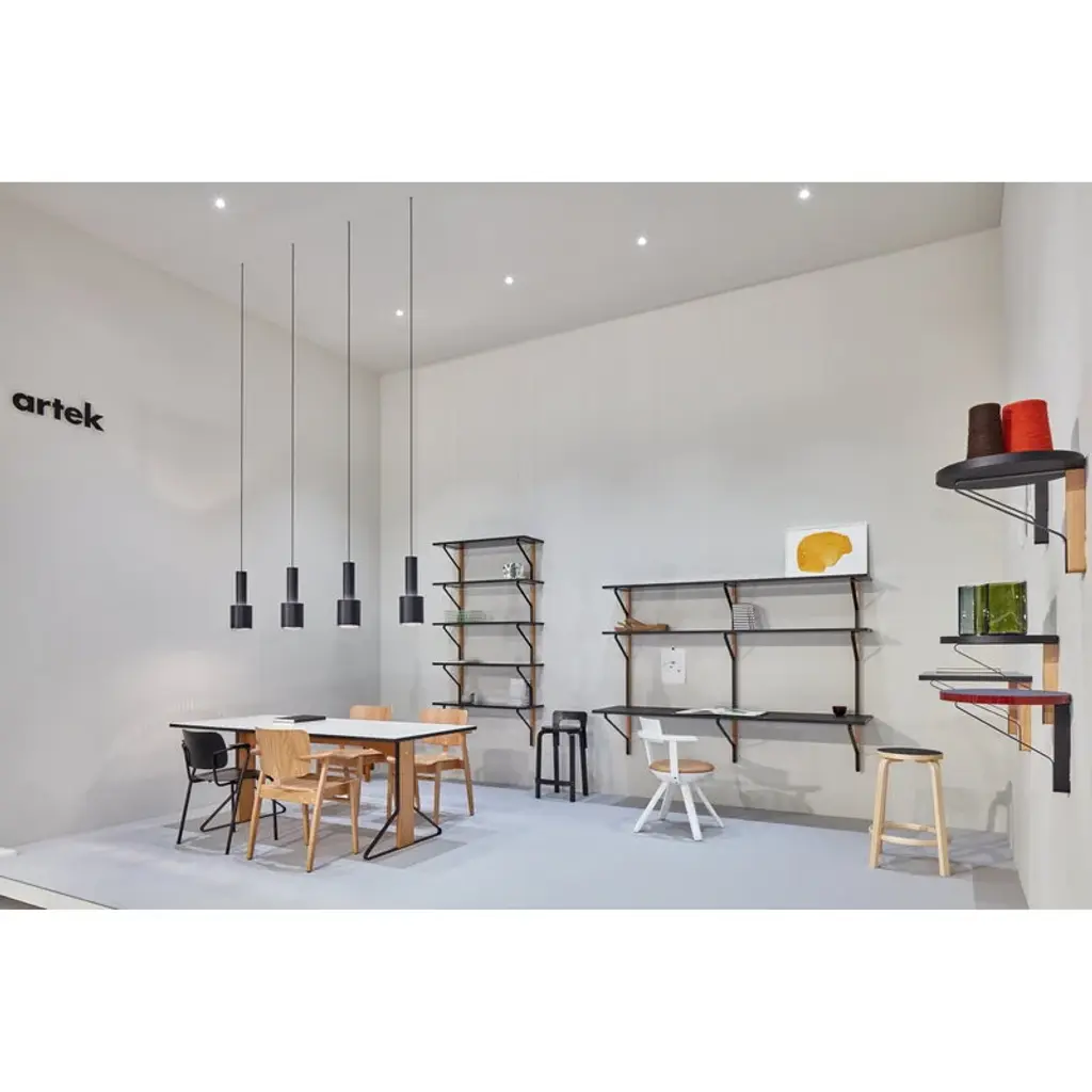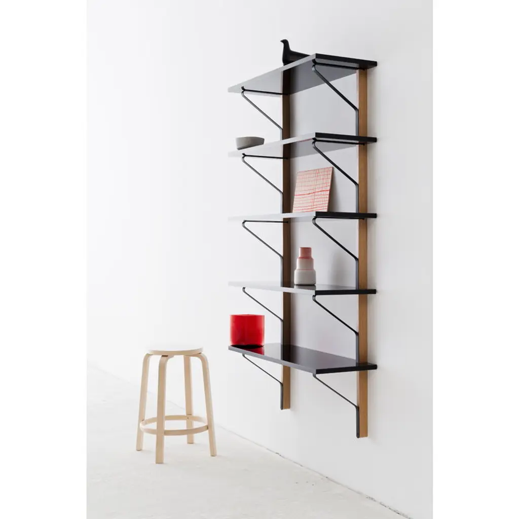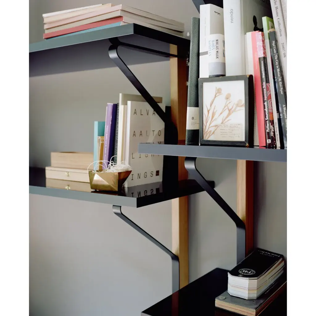 Artek’s Kaari REB 009 shelf consists of five glossy melamine shelf panels and wall brackets made of solid natural oak and powder-coated steel. The elegant Kaari collection was designed by Ronan and Erwan Bouroullec and launched at Stockholm’s Furniture Fair in 2015. As Alvar Aalto’s furniture was characterized by the L-leg, the Bouroullecs’ Kaari tables feature a unique leg system composed of vertical wood and bent steel. It became obvious during the design process that the legs could also be used to support wall-mounted objects such as shelves and consoles. The series has an attractive silhouette that is created by the wing-shaped steel structure. Kaari combines the traditional materials of Artek in a new and fresh way. Invest in a future classic and preserve it for generations to come.