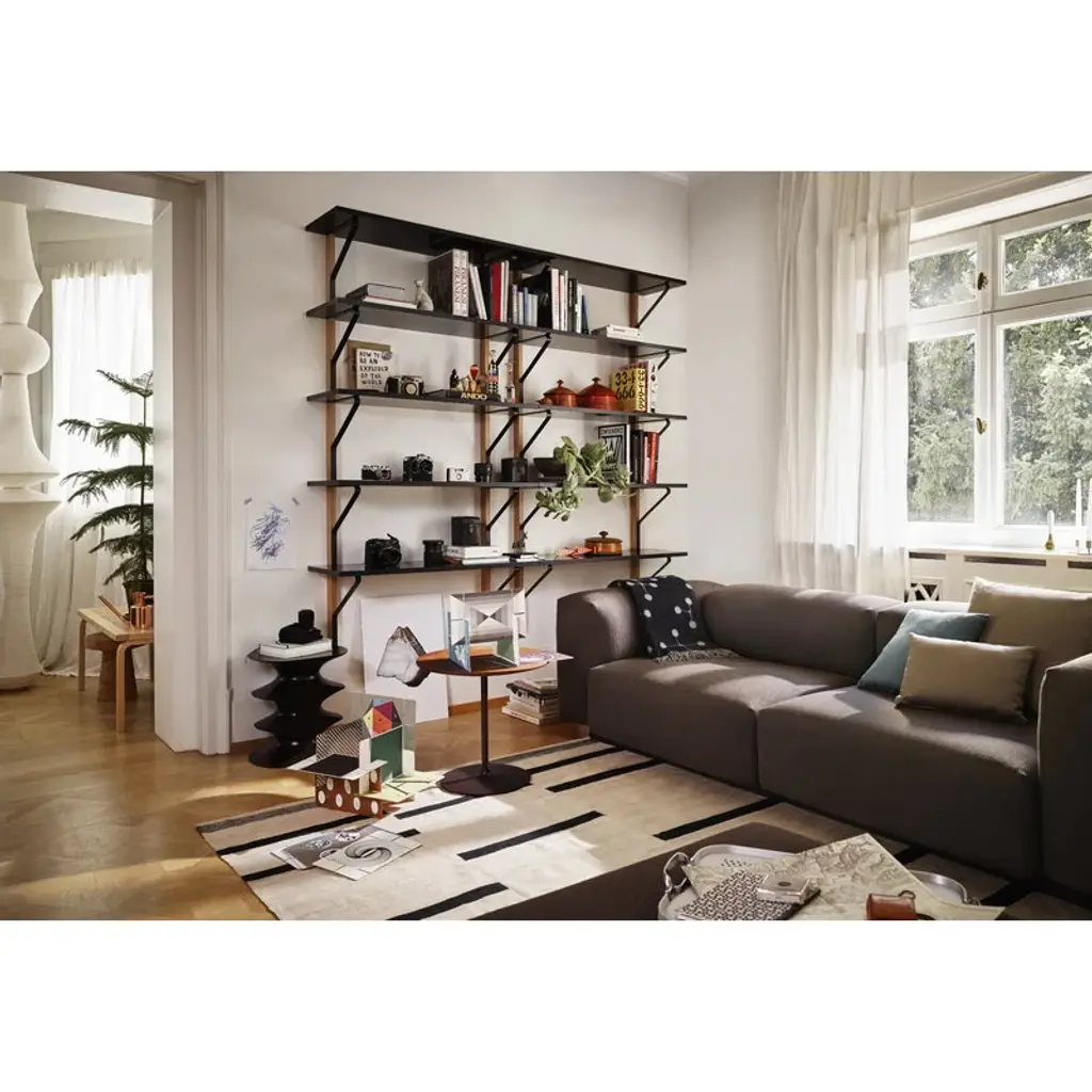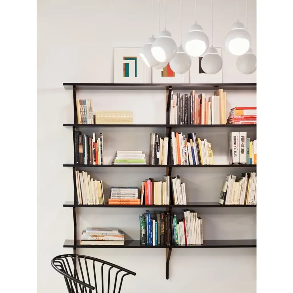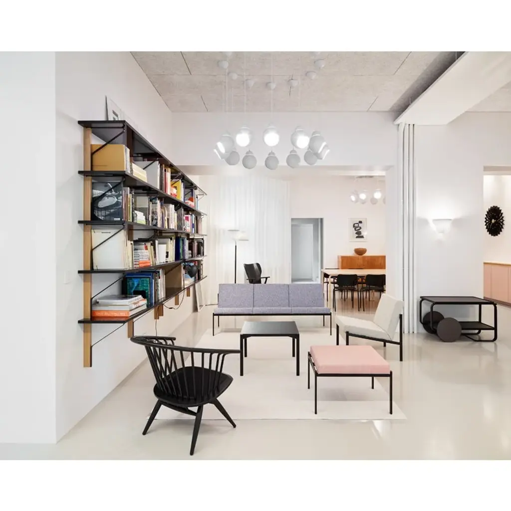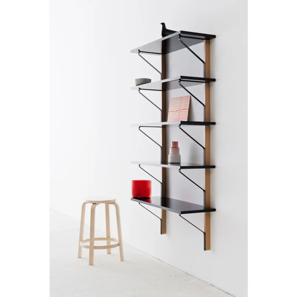 Artek’s Kaari REB 009 shelf consists of five glossy melamine shelf panels and wall brackets made of solid natural oak and powder-coated steel. The elegant Kaari collection was designed by Ronan and Erwan Bouroullec and launched at Stockholm’s Furniture Fair in 2015. As Alvar Aalto’s furniture was characterized by the L-leg, the Bouroullecs’ Kaari tables feature a unique leg system composed of vertical wood and bent steel. It became obvious during the design process that the legs could also be used to support wall-mounted objects such as shelves and consoles. The series has an attractive silhouette that is created by the wing-shaped steel structure. Kaari combines the traditional materials of Artek in a new and fresh way. Invest in a future classic and preserve it for generations to come.