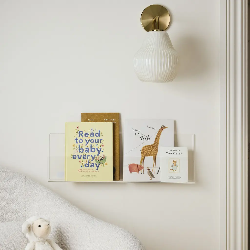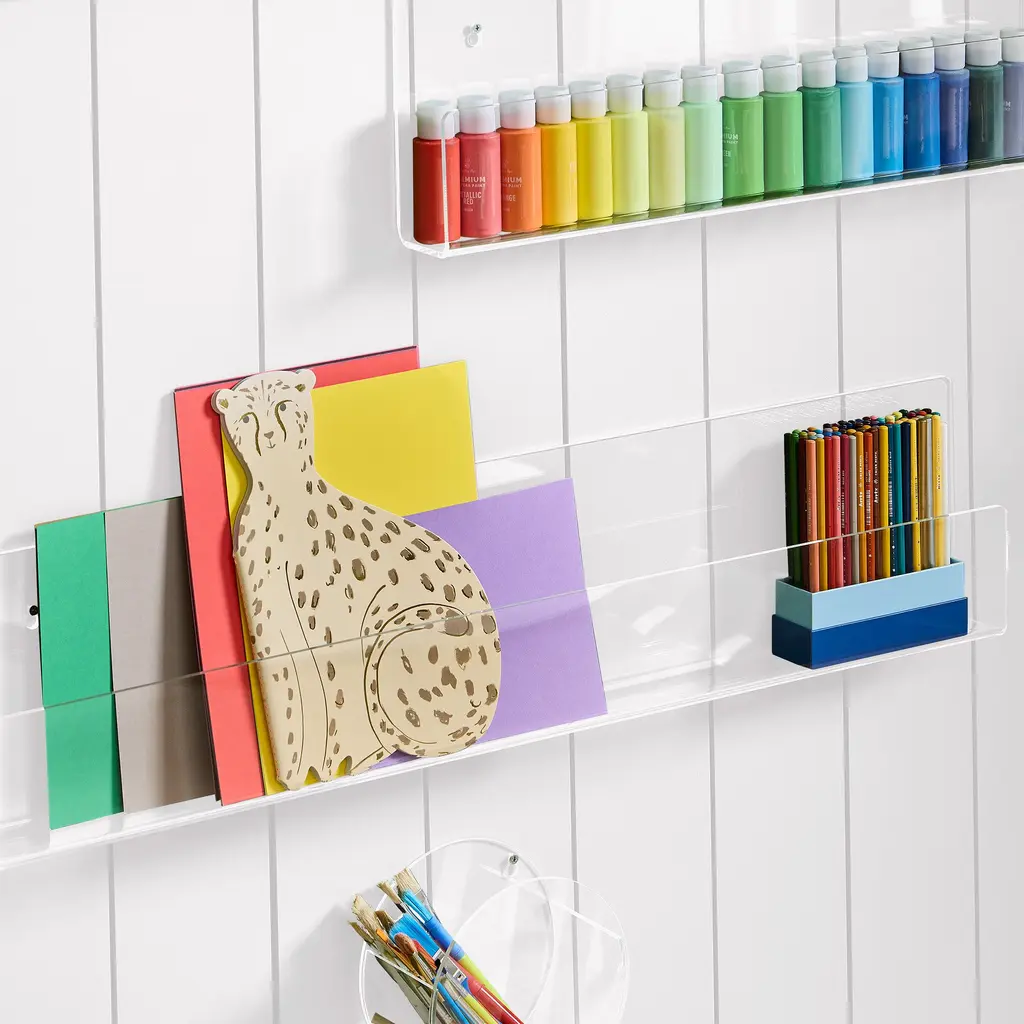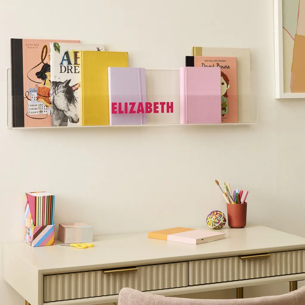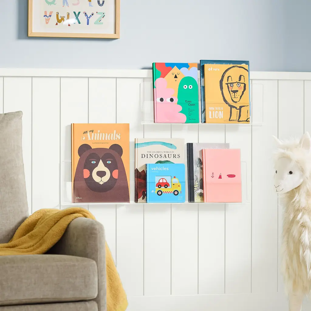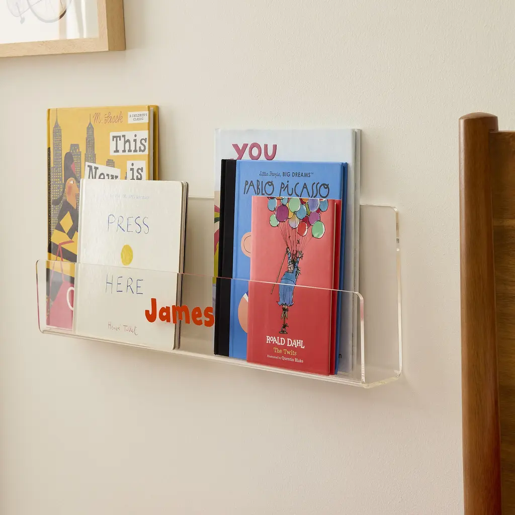 A sleek display for favorite books or photos. Acrylic is both sturdy and stylish. Available in your choice of clear or glitter. Easy to hang (plus the hardware's included).