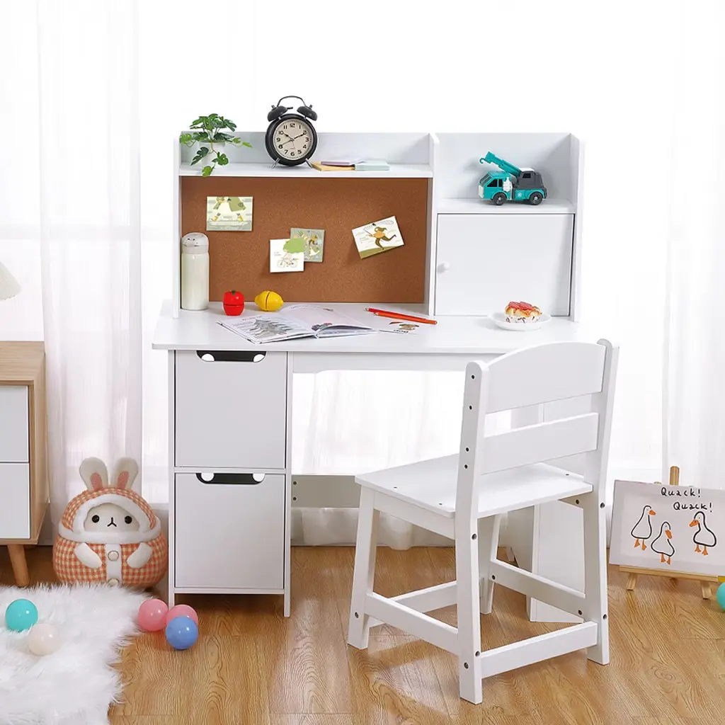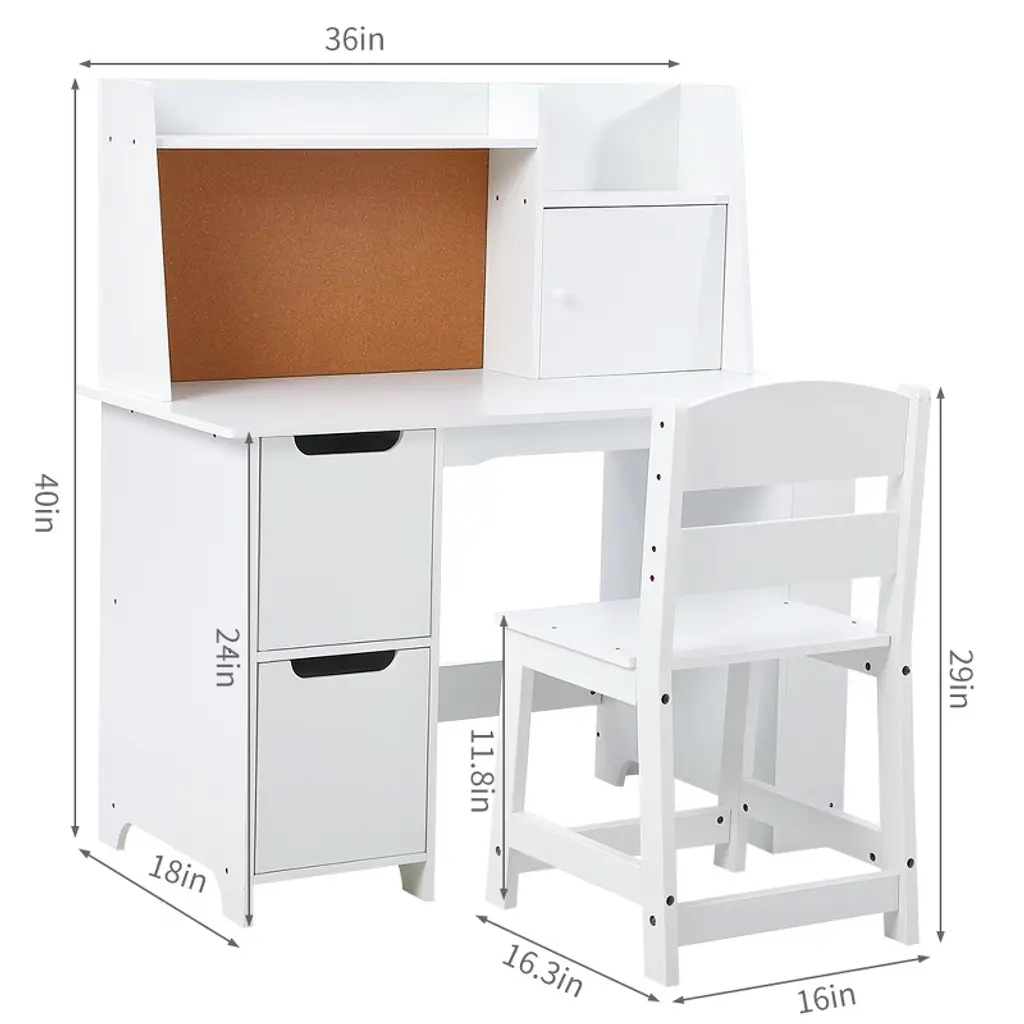 Feature:Enhance your child's learning environment with this kids desk and chair set, a perfect blend of style and functionality! This beautifully crafted wooden study table features a spacious surface ideal for homework, creative projects, and computer work. With an open storage shelf, your child can display their collections while two large drawers provide ample space for books, toys, or stationery.The integrated bulletin board allows kids to showcase artwork, important notes, and reminders, encouraging creativity and personal expression. Made from premium engineered wood, this writing table and chair set is built to endure daily use. Its smooth, waterproof surface ensures easy cleaning for a tidy workspace.With a sleek white finish, this learing desk set complements any room decor while promoting good posture and comfort for hours of focused study.Specification:Desk size: 35.83x18.11x39.37 inchesChair size: 15.55x16.34x29.13 inchesColor: whiteMaterial: engineered woodPackage dimension: 40.94x21.06x6.89 inchesPackage weight: 63.49 lbsNote:Please carefully read the following instructions and caution warnings before assembling the product.Please tighten the screws after all the part are placed in their position.Packing list:Desk x1Chair x1Hardware bagsAssembly guide x1