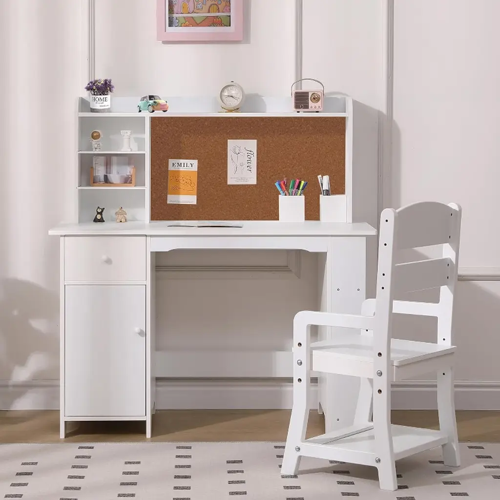 This kids' study desk has a spacious hutch with a 3-layer shelf for books and supplies. A bulletin board lets your child pin pictures and notes, while a drawer and cabinet offer secure storage for personal items, promoting organization.With its elegant wooden finish, the computer workstation fits any decor. It's a perfect gift for young learners, providing a comfortable space for studying and encouraging good habits by helping them keep their workspace tidy.