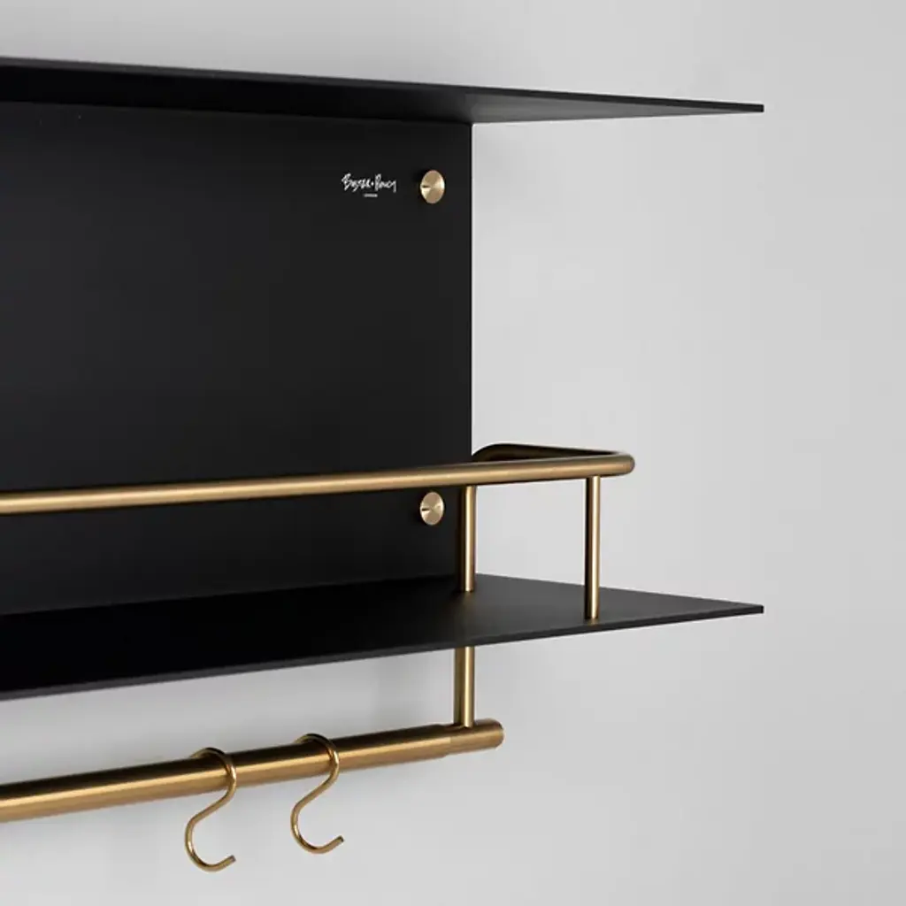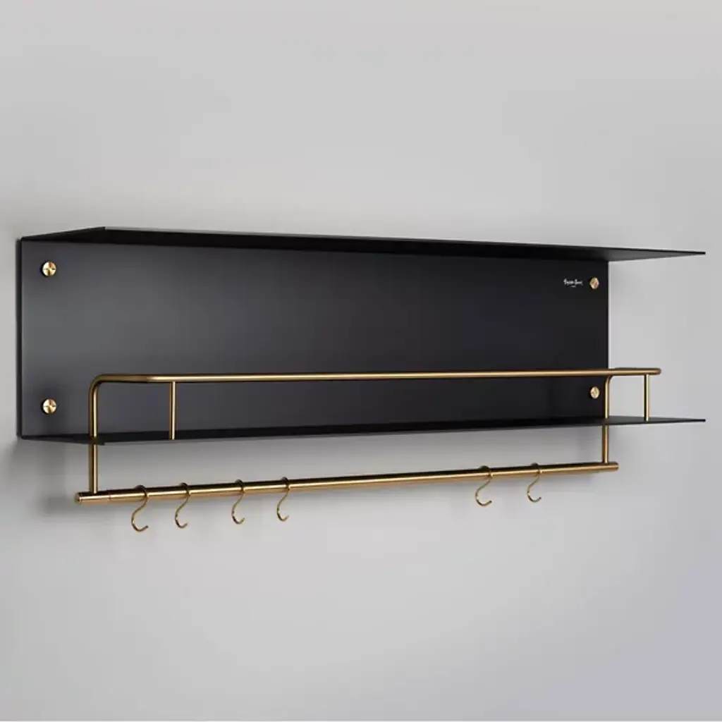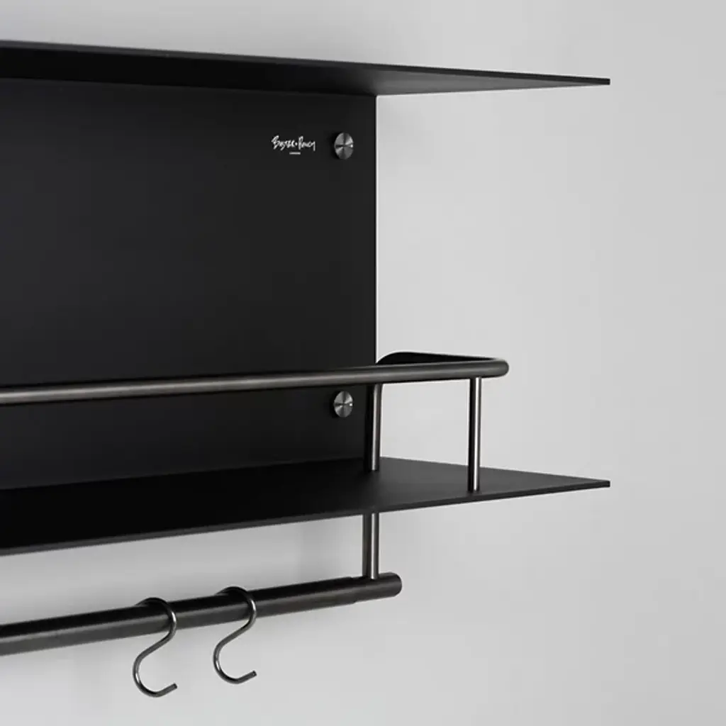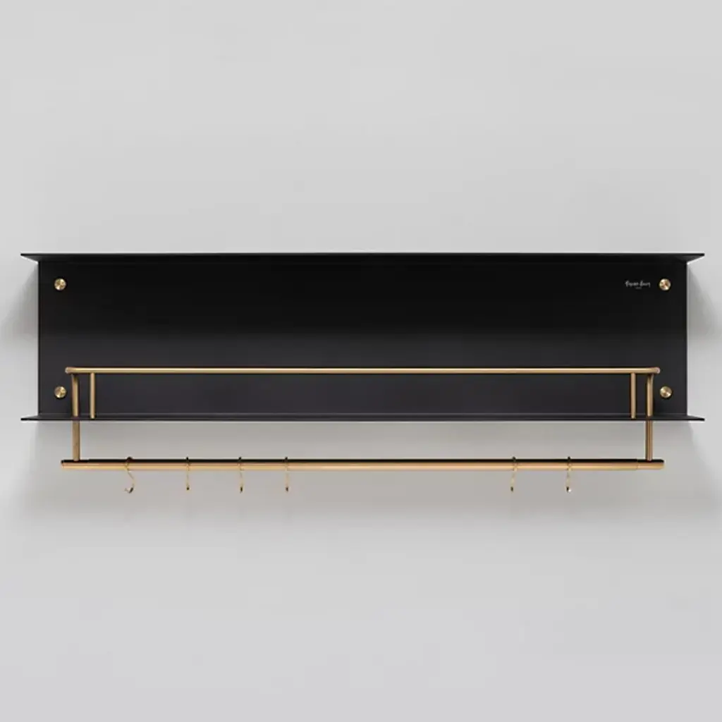 The Kitchen Hanger Wall Shelf from Buster + Punch lets you enjoy your role as chef. This hanger shelf is composed of steel and aluminum. Your durable shelf effortlessly mounts to your wall, providing a flat surface for showcasing and organizing your pots and kitchen essentials. What sets it apart is the thoughtful design, as the ends of the shelf are securely held in place by a robust rod, offering protection and stability. The shelf is fitted with hooks well-suited for hanging pans, cutlery, and more.