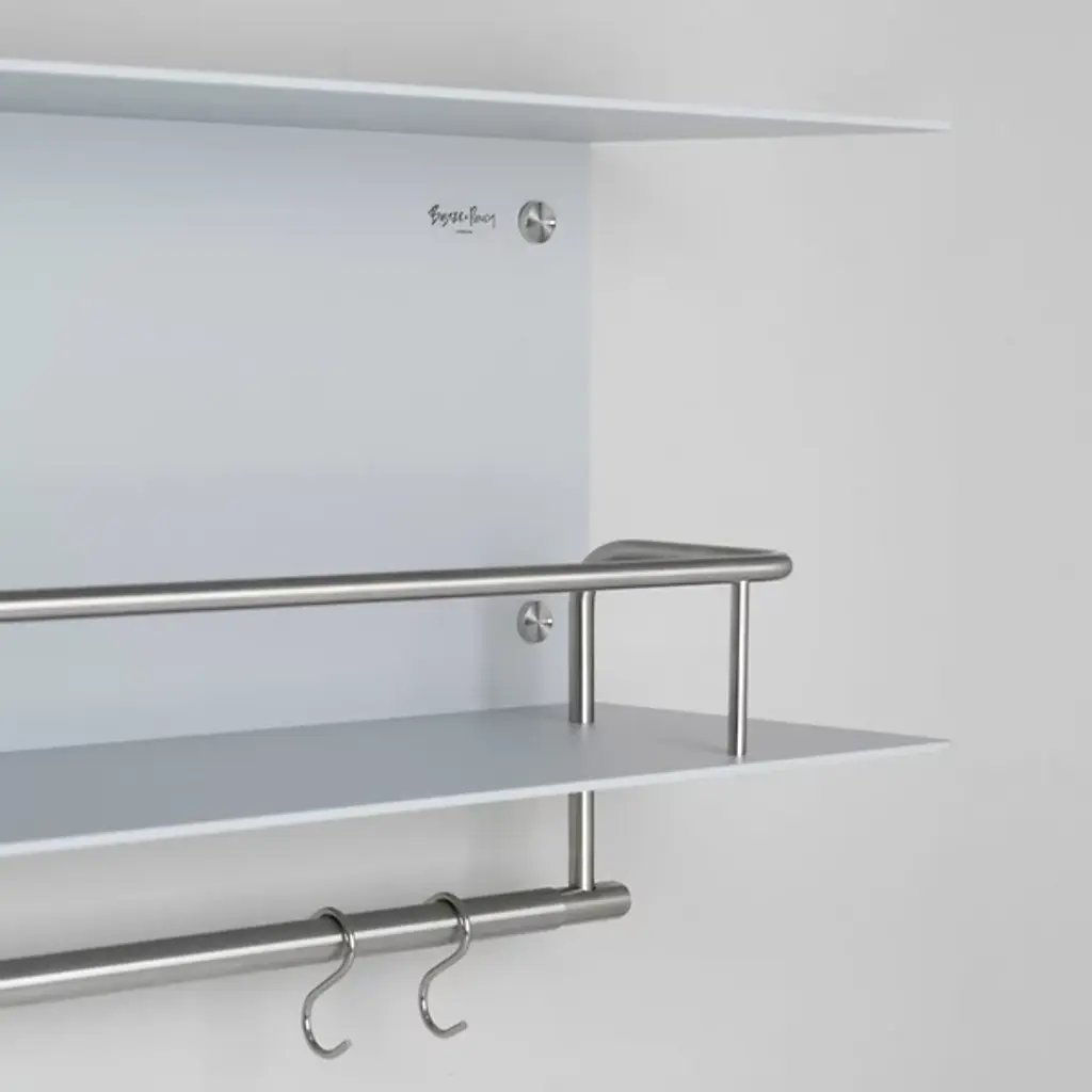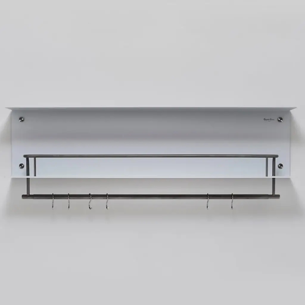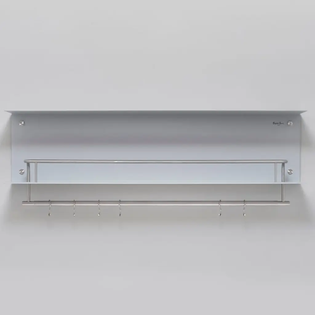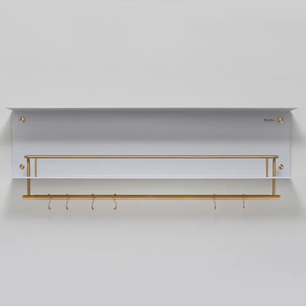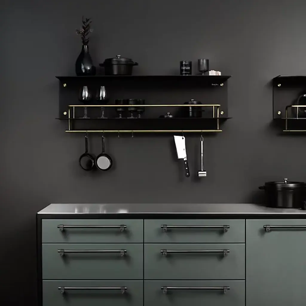 The Kitchen Hanger Wall Shelf from Buster + Punch lets you enjoy your role as chef. This hanger shelf is composed of steel and aluminum. Your durable shelf effortlessly mounts to your wall, providing a flat surface for showcasing and organizing your pots and kitchen essentials. What sets it apart is the thoughtful design, as the ends of the shelf are securely held in place by a robust rod, offering protection and stability. The shelf is fitted with hooks well-suited for hanging pans, cutlery, and more.
