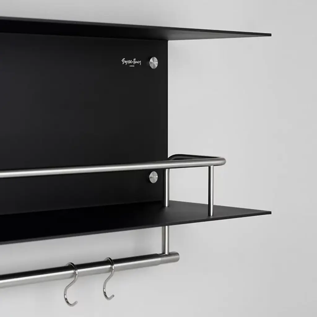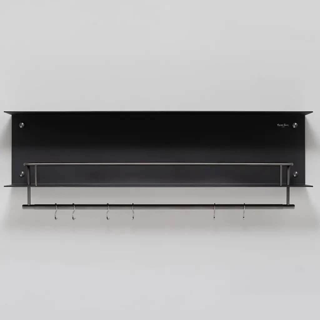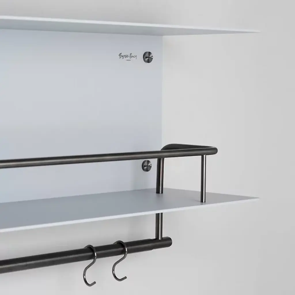 The Kitchen Hanger Wall Shelf from Buster + Punch lets you enjoy your role as chef. This hanger shelf is composed of steel and aluminum. Your durable shelf effortlessly mounts to your wall, providing a flat surface for showcasing and organizing your pots and kitchen essentials. What sets it apart is the thoughtful design, as the ends of the shelf are securely held in place by a robust rod, offering protection and stability. The shelf is fitted with hooks well-suited for hanging pans, cutlery, and more.
