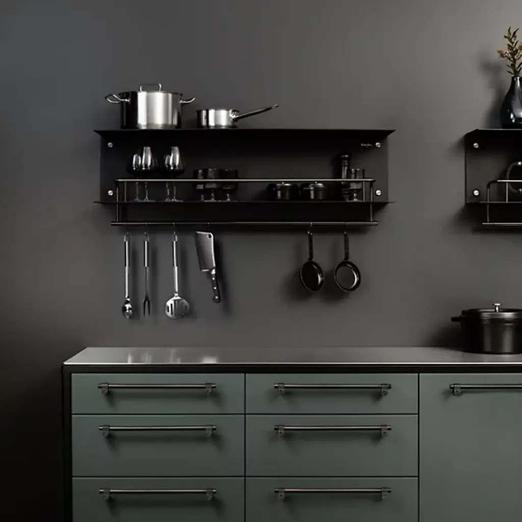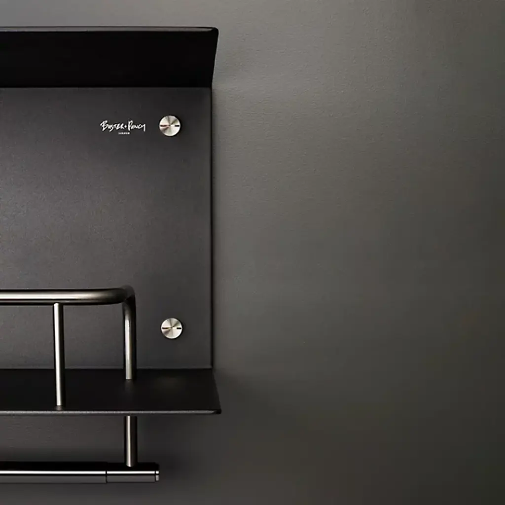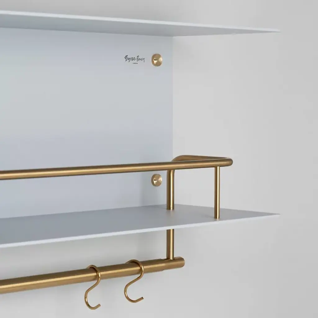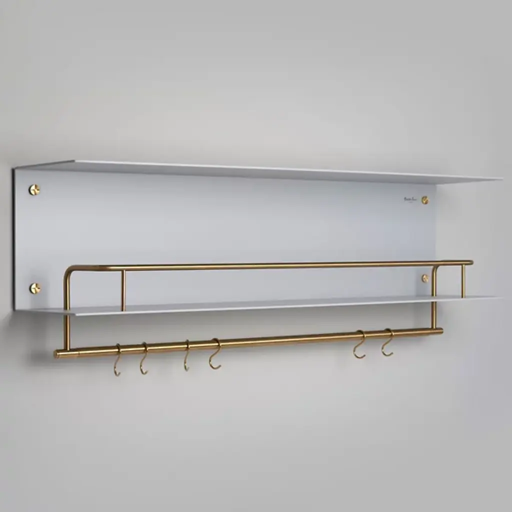 The Kitchen Hanger Wall Shelf from Buster + Punch lets you enjoy your role as chef. This hanger shelf is composed of steel and aluminum. Your durable shelf effortlessly mounts to your wall, providing a flat surface for showcasing and organizing your pots and kitchen essentials. What sets it apart is the thoughtful design, as the ends of the shelf are securely held in place by a robust rod, offering protection and stability. The shelf is fitted with hooks well-suited for hanging pans, cutlery, and more.