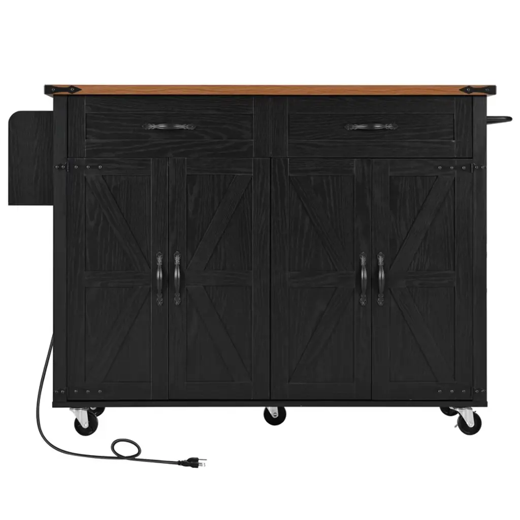 Infuse your home with the warmth of farmhouse charm using our Large Kitchen Island, a perfect blend of elegance and practicality. Measuring 53.5�W x 28.75�D x 36.5�'H, this island showcases a beautiful farmhouse style with a brown wood grain tabletop and black wood grain cabinet, accented by metal trim and hinges for a touch of retro sophistication. It�s designed to complement any dining room or living area, adding a rustic touch that blends seamlessly with your kitchen decor.