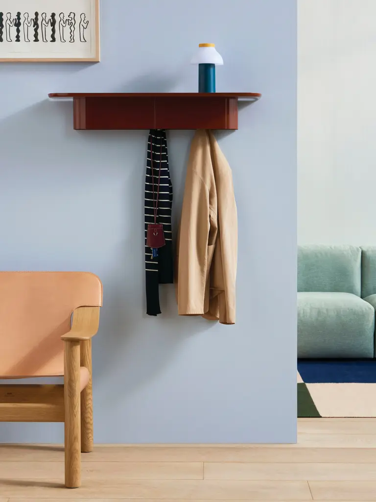 Korpus is a series of colorful wall-mounted shelves created for HAY by Norwegian product designer Andreas Bergsaker. A durable, versatile option that can be used in many rooms, Korpus is made from sheet aluminum, known for its lightness, strength, and ability to be reused countless times. The aluminum undergoes an industrial stamping and punching process to be formed into the distinctively curved column and top.