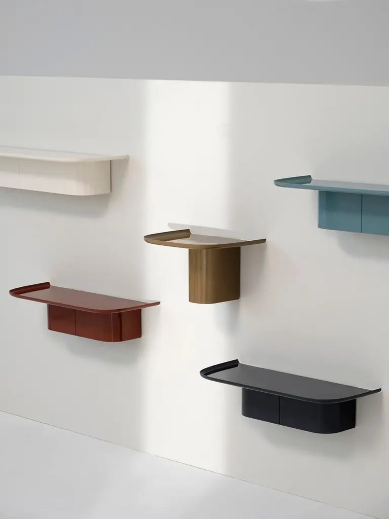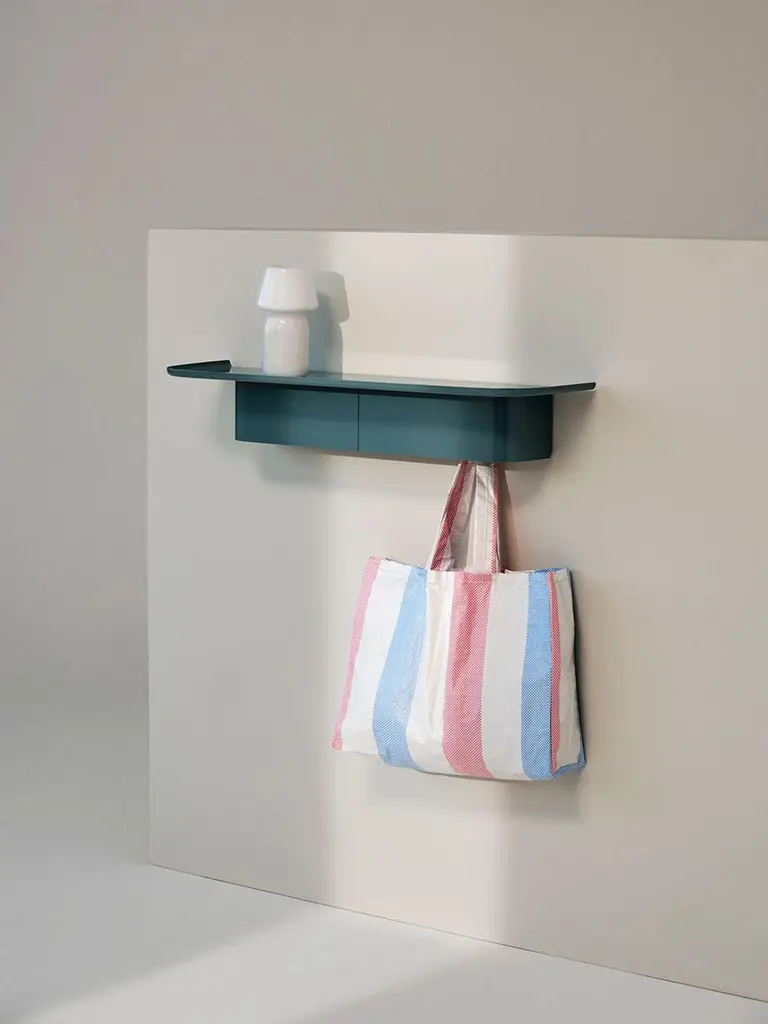 Korpus is a colourful wall-mounted shelf created for HAY by Norwegian product designer Andreas Bergsaker. Based on the desire to create a durable multi-purpose shelf from recyclable material, Korpus Shelf is made from sheet aluminium, known for its lightness, strength and ability to be reused countless times. The aluminium undergoes an industrial stamping and punching process to be formed into the distinctively curved column and top. Keyhole slits at the back facilitate mounting, while concealed hooks in the column provide additional hanging possibilities. Korpus Shelf L 7 hooks.MaterialsShelf2 mm Powder coated aluminum with high-gloss finish.
