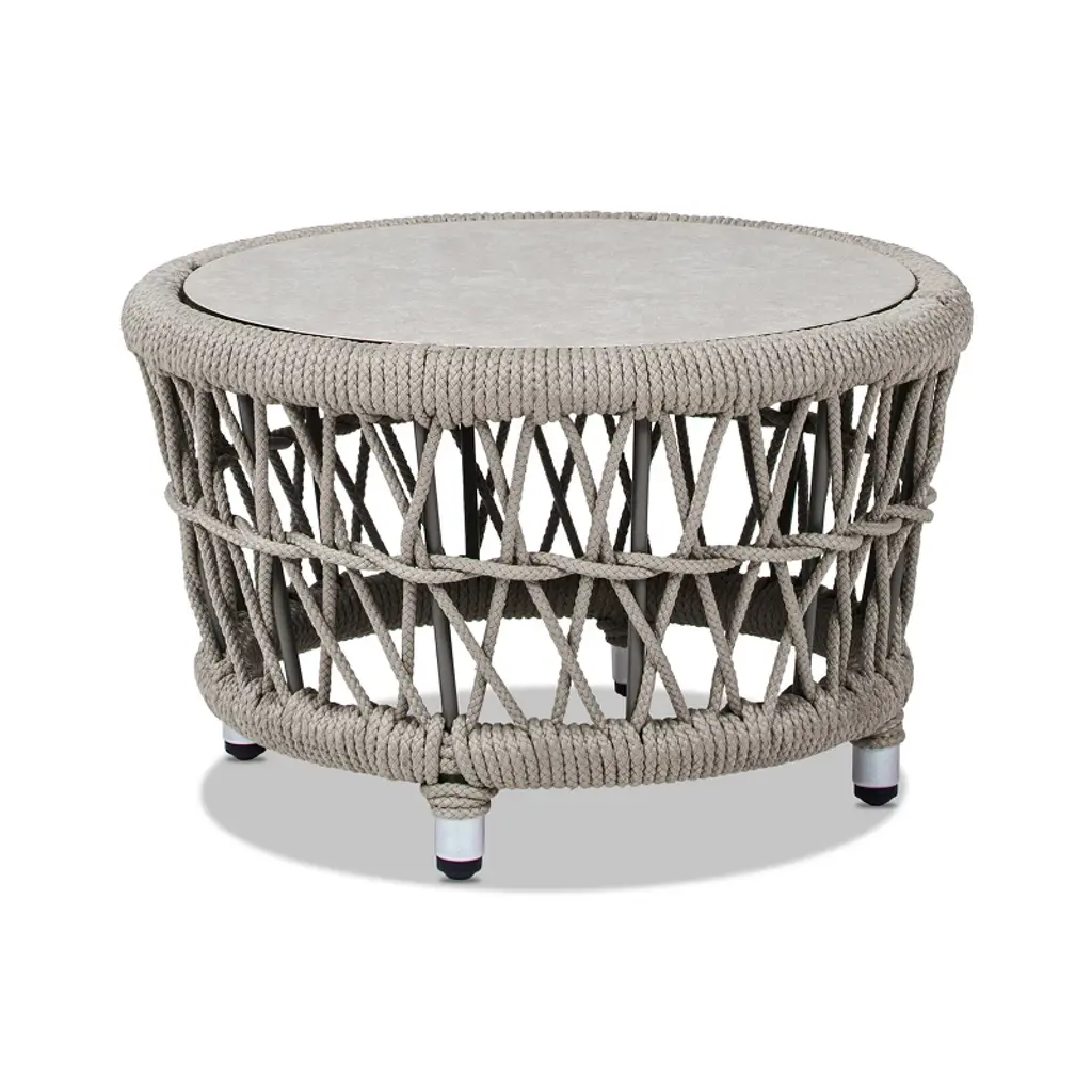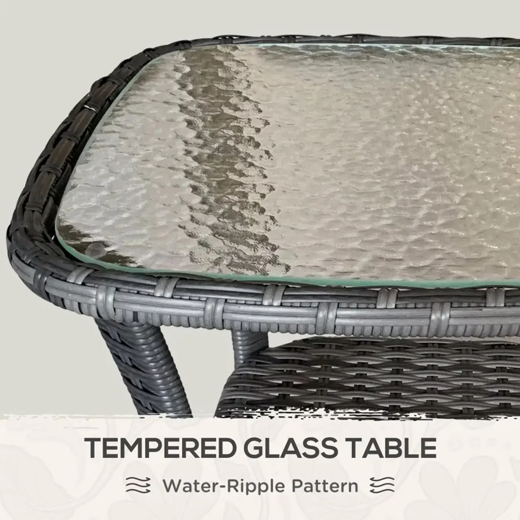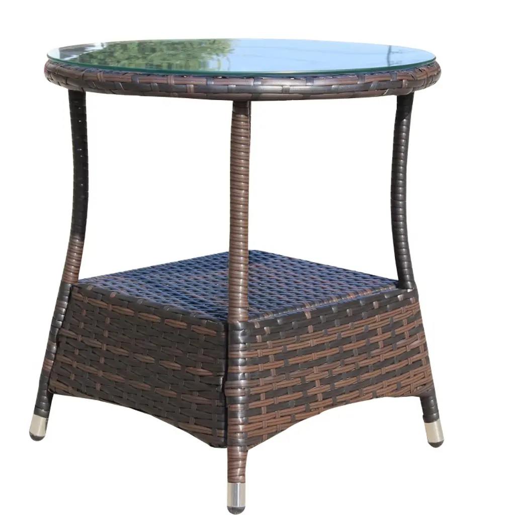 Add a touch of understated sophistication to your space with this stylish wicker outdoor side table. Featuring a stunning water-ripple patterned tempered glass top, it creates a refined focal point for patios, balconies, or sunrooms. Whether you’re sharing drinks, snacks, or simply need a spot for your book or phone, this coffee table pairs effortlessly with any sofa or outdoor seating arrangement. A lower shelf offers convenient storage, helping you keep essentials organized and within reach. Crafted from handwoven PE rattan, it captures the tropical charm of classic wicker while offering excellent UV and weather resistance. Reinforced with a water-safe, powder-coated steel frame, this table is built for strength and durability.Product Details:Overall Dimensions: 19.7" L x 19.7" W x 21.7" HWeight Capacity: 110 lbsAssembly Required