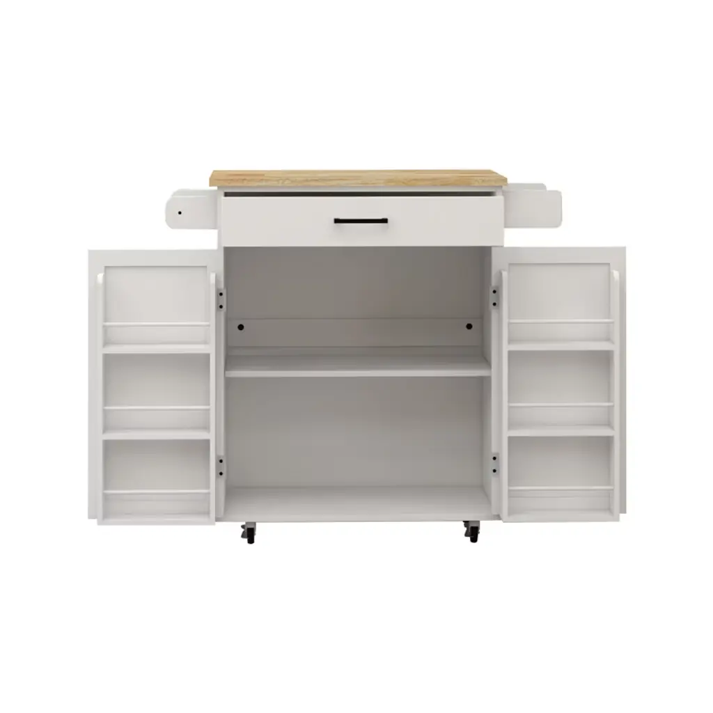 This kitchen island features a rubberwood top and a pull-out drawer, providing hidden storage for cutlery and napkins. The wheels are easy to move around the kitchen, and the casters are lockable. A towel rack and a spice rack are located on either side of the island, allowing for easy access to kitchen towels or spices, and they also serve as handles when moving the cart.