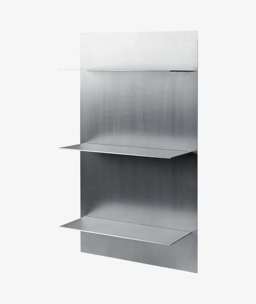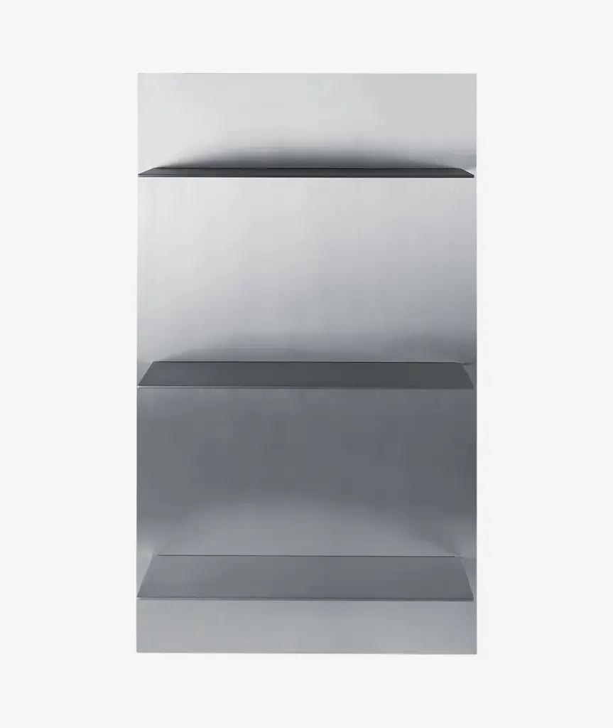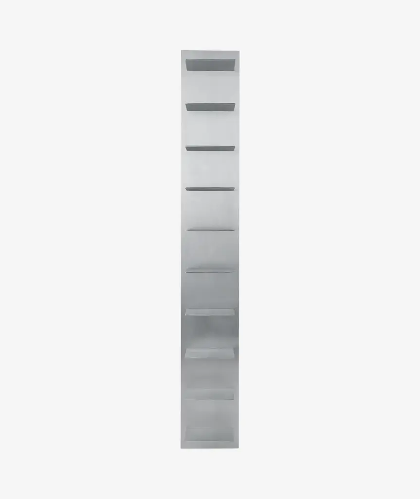Crafted from aluminum and referencing industrial and brutalist aesthetics, the Lager Wall Shelf offers sleek, functional storage to any space. Its design facilitates simple wall installation using a French cleat hanging system, and the uniform spacing between sections allows for the stacking of multiple shelves, perfect for a cohesive and tall library display.