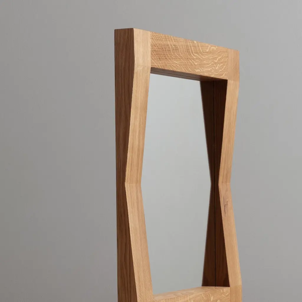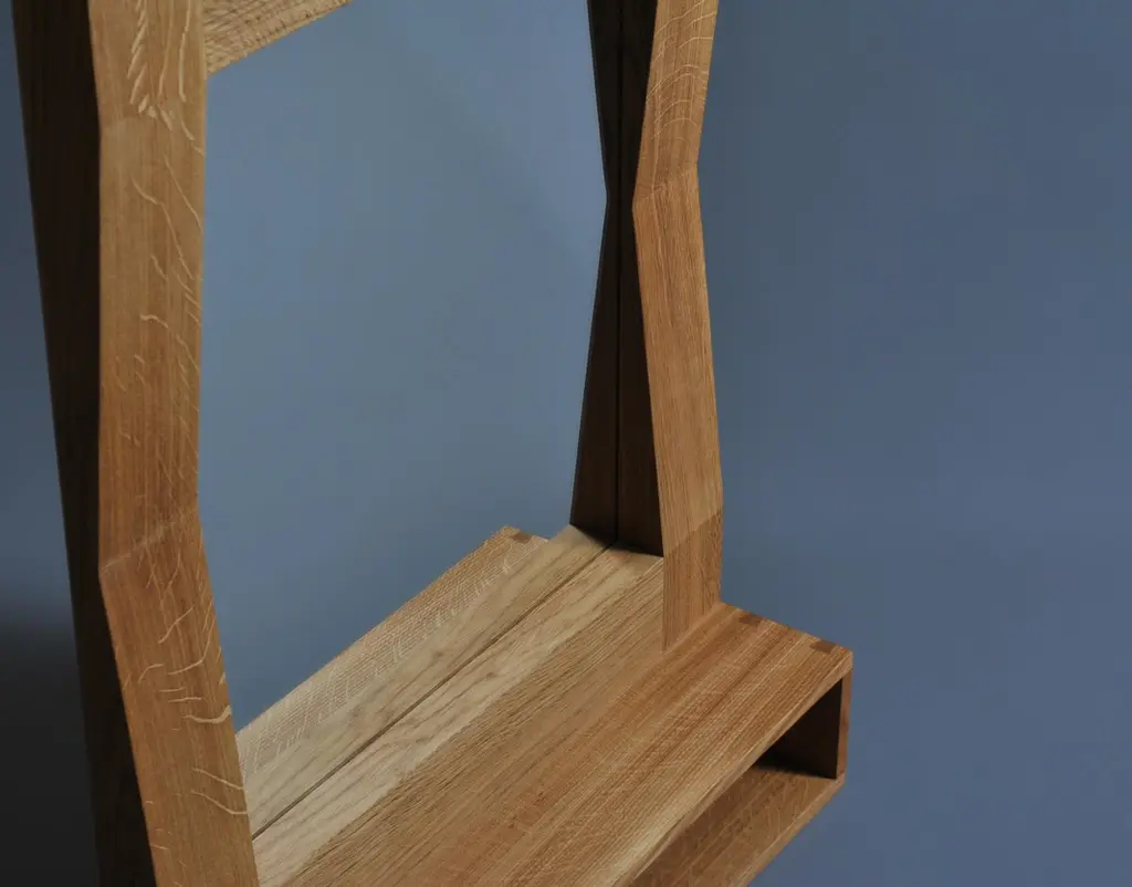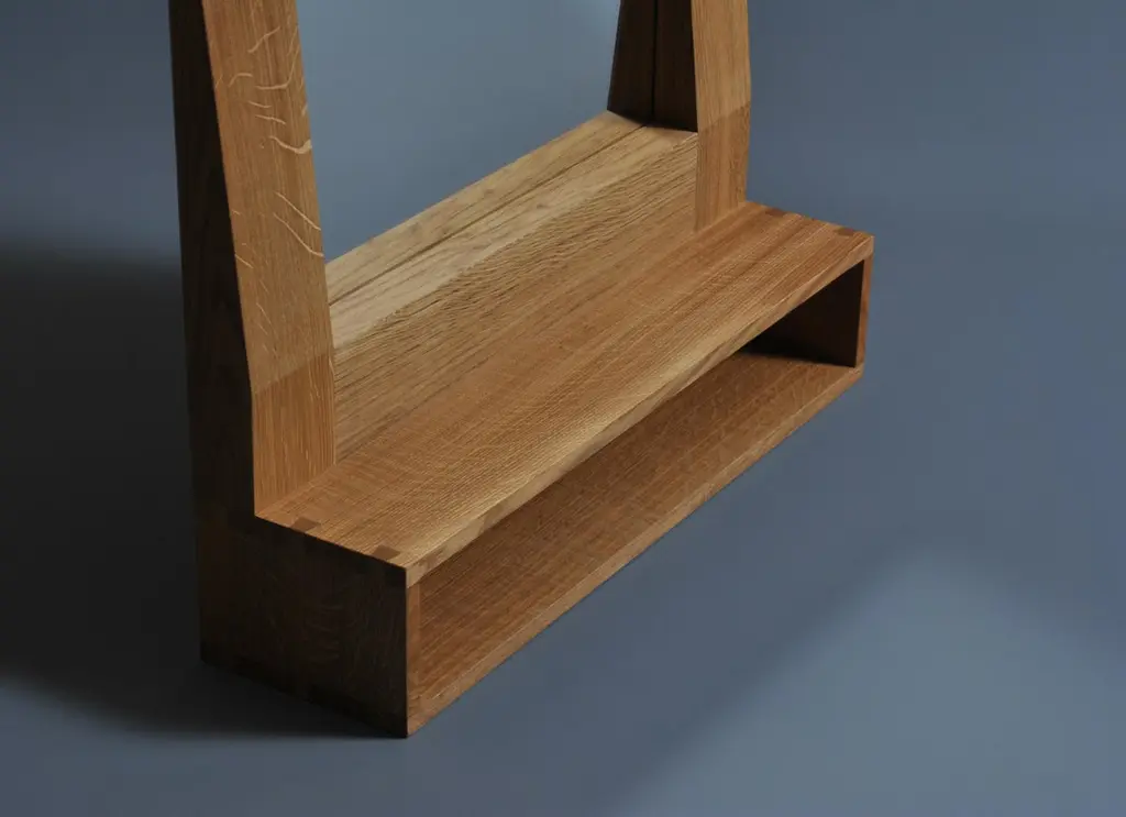 Large handcrafted ‘furrow’ oak framed mirror with shelf. Designed by SUM furniture and handcrafted in finest fully quartersawn English oak. Hand finished in natural oils. The furrow mirror creates a striking presence and gives the illusion of it having once been folded. This works perfectly with our handmade oak console/vanity tables or used as an entry/hallway piece.custom sizes are available upon request.Keyhole hangers fitted to the back for safe and easy hanging.We design bold and distinctive pieces of furniture – our main objective is combining the design alongside the natural beauty and properties of the raw materials.These timbers and materials are very carefully chosen for each specific design - maintaining our focus on the benefits, visual impact and strengths of what we use. Our regular use of English Quartersawn Oak is one case in point. It has been the beloved timber of fine furniture makers across the world for centuries. It is costly to produce but gives huge benefits and rewards such as its striking medullary rays and superb stability qualities. By utilising these wonderful and naturally occurring features with our contemporary designs we aim to continue creating some very distinct, tactile and idiosyncratic pieces.These are all completely handmade, in very small numbers, by our skilled craftspeople in England.