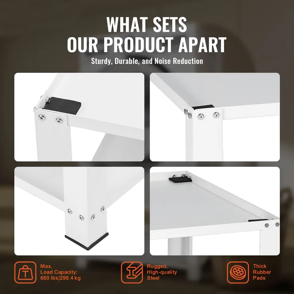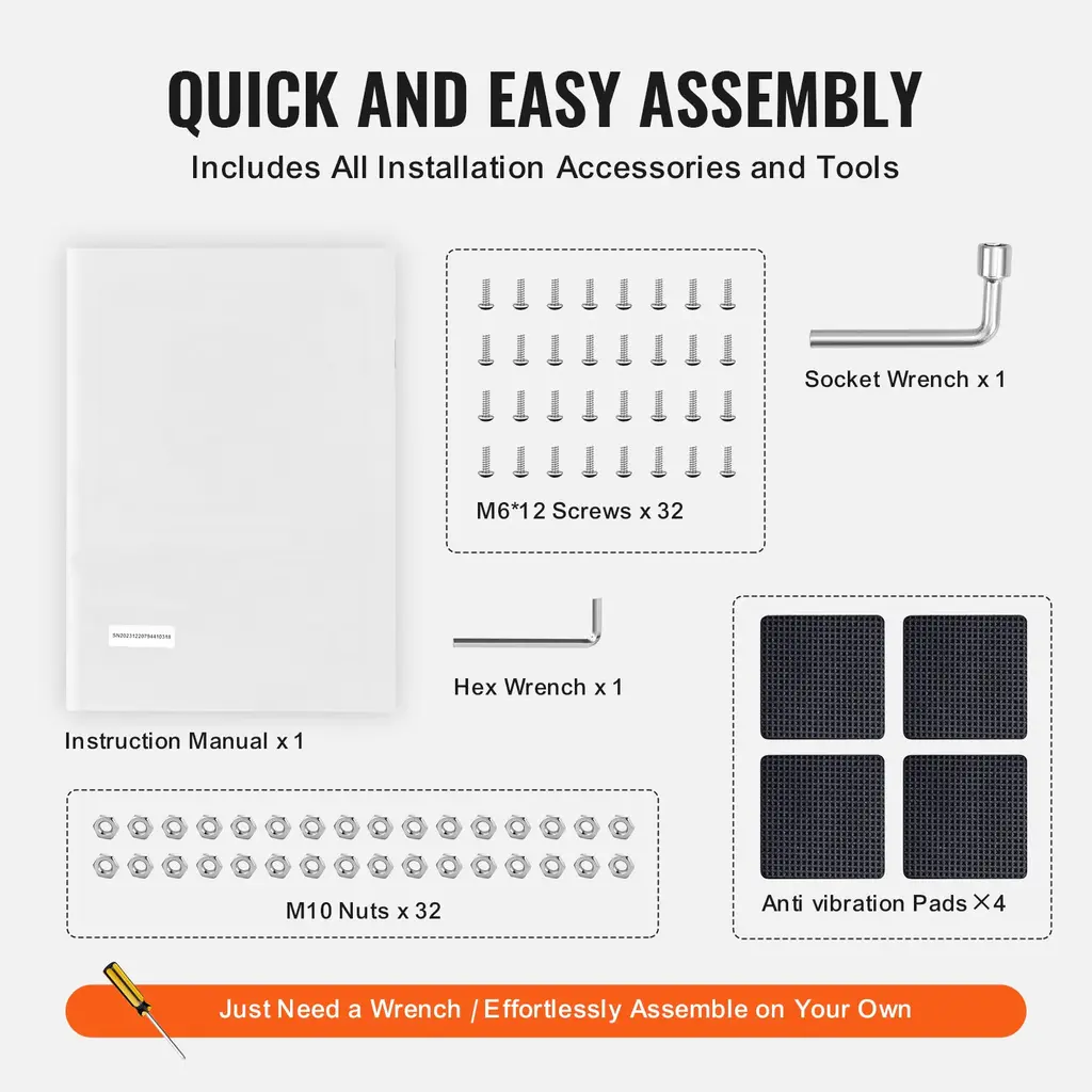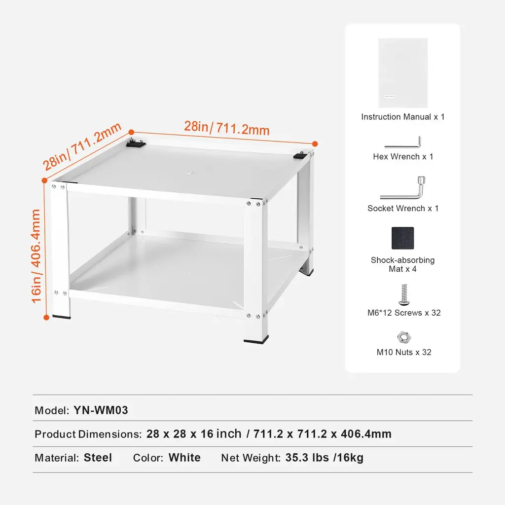 Sturdy and Durable Noise Reduction: Made from SPCC cold-rolled steel plate, the pedestal is extremely robust and can accommodate washing machines weighing up to 660 pounds (299.4 kg). Quick and Easy Assembly: The standard version is easy to install and comes with assembly instructions. You can easily assemble it on your own with just a screwdriver. Universally Compatible with Various Models: The intuitive design is suitable for all standard machines, including Samsung, LG, Whirlpool, General Electric, Miele, Electrolux, Bosch, and more. So you can confidently elevate your washing machine and dryer. Easier Laundry Days: The washing machine pedestal can lift your washer 16/14.3 inches (406.4 mm) off the damp floor, bringing it to a more ergonomic working height. This reduces the strain on your back and knees, allowing you to load clothes without excessive bending and maintaining the correct posture while doing laundry. Extra Storage Space: The pedestal comes with a storage shelf, providing additional storage space for laundry baskets and other items, keeping your area tidy and organized. Package Content Laundry Pedestal x 1 Instruction Manual x 1 Hex Wrench (Allen Key) x 1 Socket Wrench x 1 EVA Shock Absorption Pads x 4 M6*12 Screws x 32 M10 Nuts x 32 (Laundry Pedestal x 1 Instruction Manual x 1 Hex Wrench (Allen Key) x 1 Socket Wrench x 1 EVA Shock Absorption Pads x 4 Drawer Handle x 1 M6*12 Screws x 28 M10 Nuts x 28 M4*7 Screws x 2)for 14.3in option