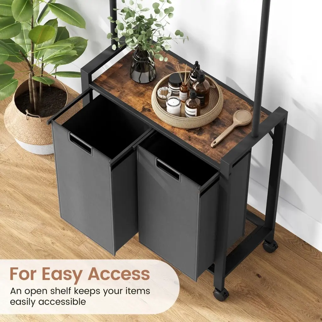 Laundry Sorter 2 Section With Extendable Hanging Bar, Heavy Duty Laundry Basket With Rolling Lockable Wheels And Shelf, Laundry Room Organization