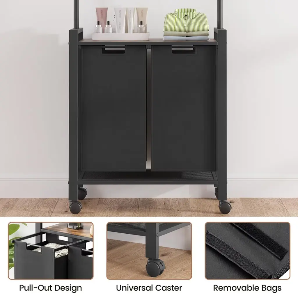 2-Section Laundry Sorter with Extendable Hanging Bar ¨C Heavy-Duty Rolling Hamper with Lockable Wheels & Storage ShelfBrand: TROPOWColor: Rustic BrownMaterial: Powder-Coated Metal Frame + Fabric BinsDimensions:29.5"L x 12.8"W x 69.3"H(extends to 53.3" with hanging bar)Special Features:? Extendable hanging bar (up to 53.3")? 4 lockable wheels (carpet & hard floor compatible)? Built-in storage shelf for detergents? Rust-resistant metal constructionProduct OverviewThe TROPOW 2-Section Laundry Sorter combines smart organization with heavy-duty functionality, featuring dual 13-gallon bins for separating lights/darks, a retractable hanging bar for air-drying clothes, and smooth-rolling lockable wheels for easy mobility.Perfect for small laundry rooms, apartments, or shared spaces, this rustic-style hamper keeps dirty clothes organized while providing extra storage for detergents and supplies. The powder-coated steel frame ensures stability, while the extendable design accommodates bulky items like blankets and curtains.Key Features1. Smart Dual-Compartment Sorting Two 13-gallon removable bags ¨C Separate whites, colors, or delicates Middle storage shelf ¨C Holds detergents, fabric softeners, or stain removers 2. Extendable Hanging Bar (Up to 53.3") Retractable design ¨C Expands for drying large items (sheets, jackets, curtains) Heavy-duty support ¨C Holds multiple garments without sagging 3. Easy Mobility & Secure Locking 4 smooth-rolling wheels ¨C Glides on hard floors & carpets Push-button wheel locks ¨C Prevents unwanted movement (kid & pet-safe) 4. Durable, Rust-Resistant Build Powder-coated steel frame ¨C Resists humidity & bathroom moisture Reinforced base ¨C Supports heavy loads without bending 5. Quick Tool-Free Assembly No tools required ¨C Simple snap-together setup in under 30 minutes Includes instructions & hardware Why Choose This Laundry Sorter?? Saves Space ¨C Compact yet expands when needed? Kid/Pet-Safe ¨C Locking wheels prevent tipping? Multi-Functional ¨C Sorts, stores, and air-dries clothes? Rustproof ¨C Perfect for humid bathrooms & laundry rooms