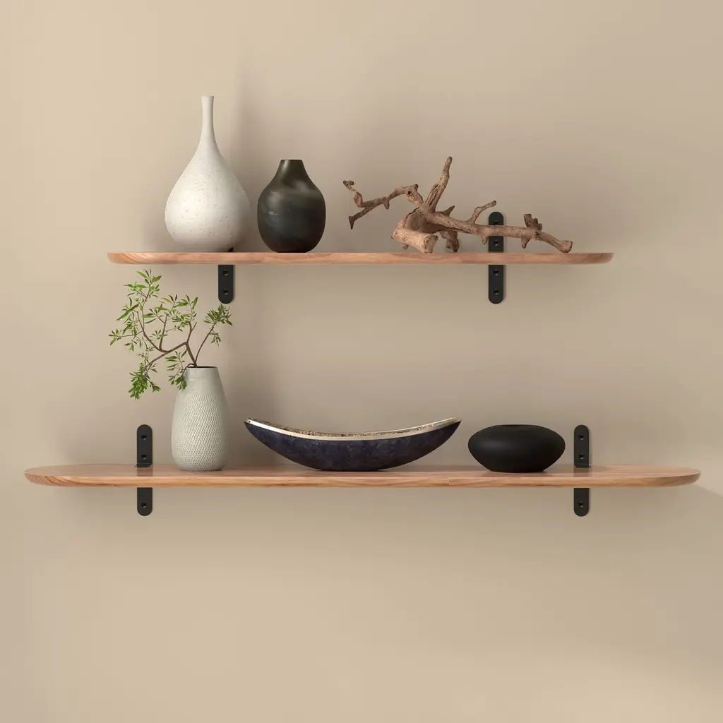 Add something unique and minimalist to your blank wall with this floating shelf. Built-in decorative steel brackets make this shelf perfect for the living room, bedroom, kitchen, office, etc.