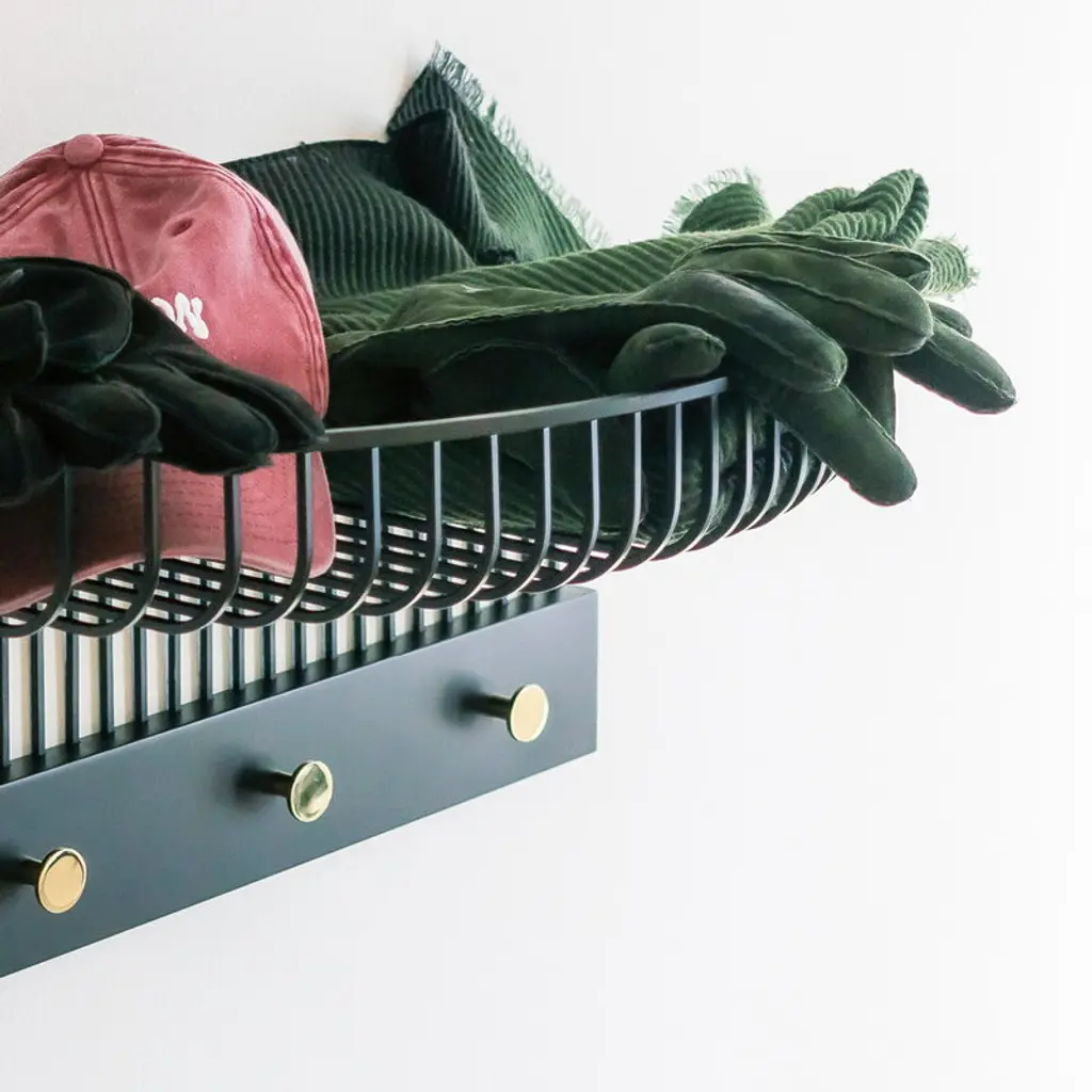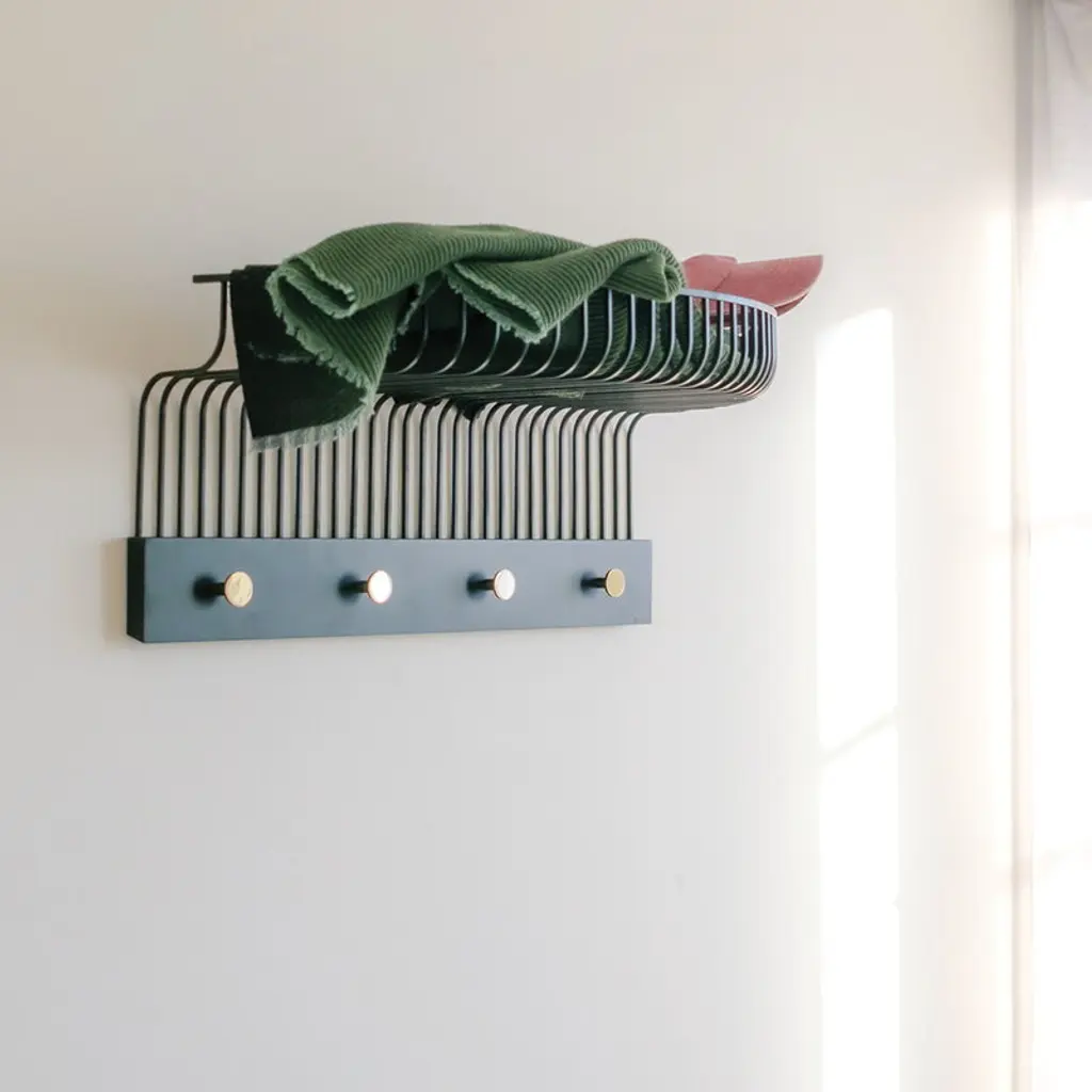 Klong's Lunett hat shelf adds storage space to both the hallway and the bedroom lightly yet beautifully. The steel hat rack features clever knobs for silk scarves, jewelry and other accessories, and a handy top basket for hats and caps, for example. Designed by Markus Johansson, the sculptural shelf can be hung on the wall on its own or as a combination of two or more shelves – the Lunett shelves together form a beautiful wavy pattern on the wall.