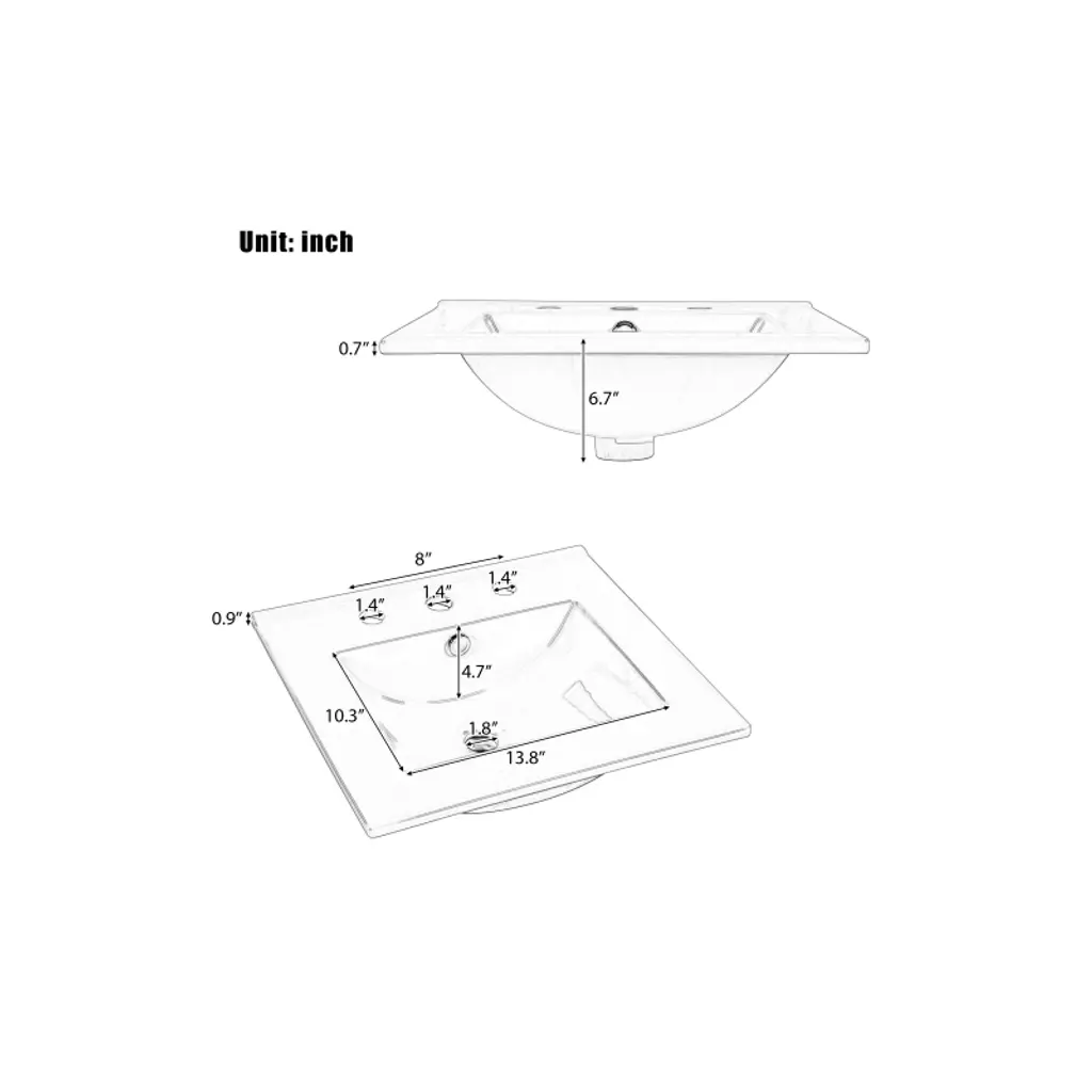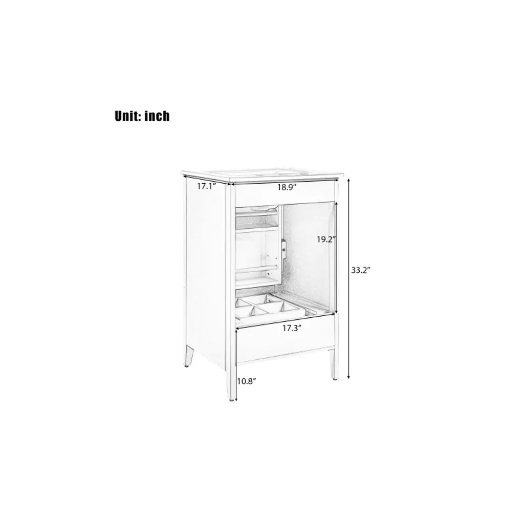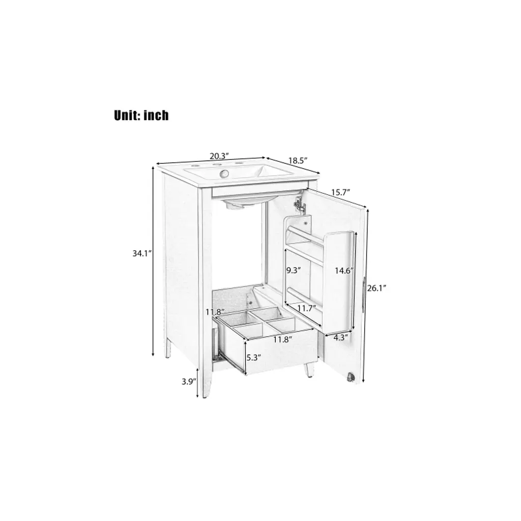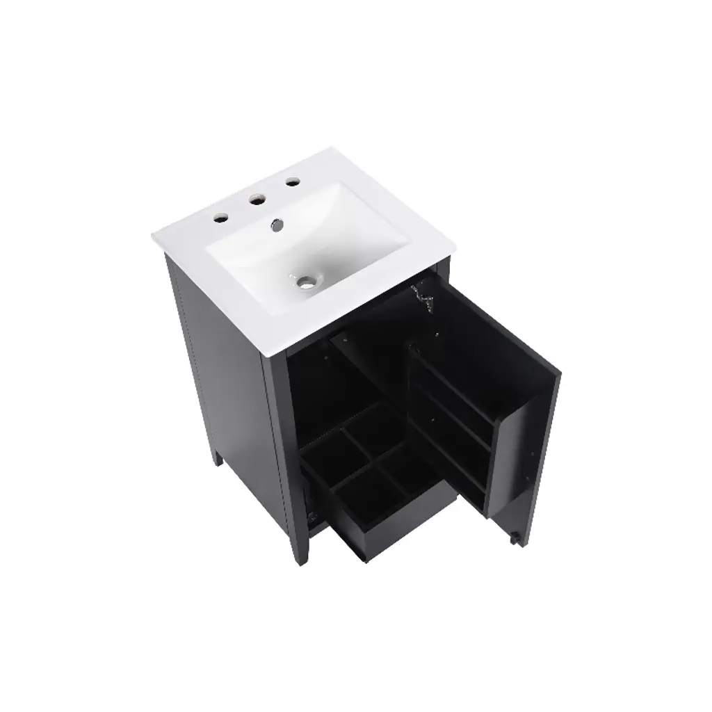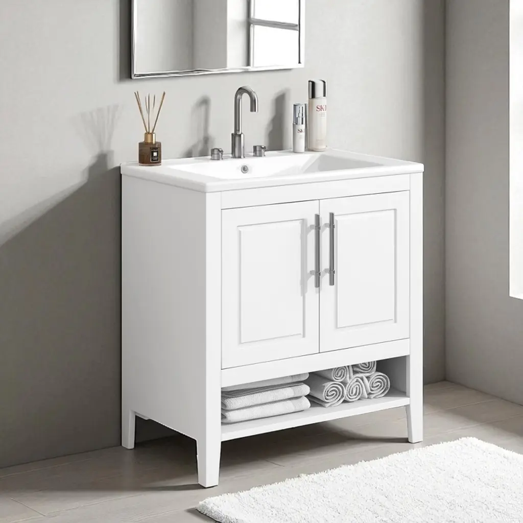 Maximize style and functionality in your Vanity Bathroom with this Small Freestanding Bathroom Vanity— a compact yet durable solution designed for smaller spaces. As a Bathroom Vanity with Sink, it features a smooth, waterproof solid ceramic sink (resists water stains, easy to clean) with 3 pre-drilled holes (compatible with 8" widespread faucets, faucet not included) and a chrome-finish overflow to prevent spills. Crafted for long-lasting use, it combines a sturdy solid Acacia wood frame with high-quality MDF boards, topped with an easy-to-clean painted finish and subtle groove line design for added charm. Designed as a practical Bathroom Storage Cabinet, it offers smart organization: a cabinet with a door shelf and an internal functional drawer (removable panel, perfect for customizing storage zones) to keep soaps, towels, shampoos, and other Vanity Bathroom essentials dust-free. It includes user-friendly details like rust-resistant metal hinges, soft-closing door technology (quiet operation, plus a door stopper), and a sleek gold handle for a touch of elegance. Shipped in one package with all hardware and a manual, this Bathroom Vanity takes ~30 minutes for 2 people to assemble, and its open-back design ensures easy plumbing access.