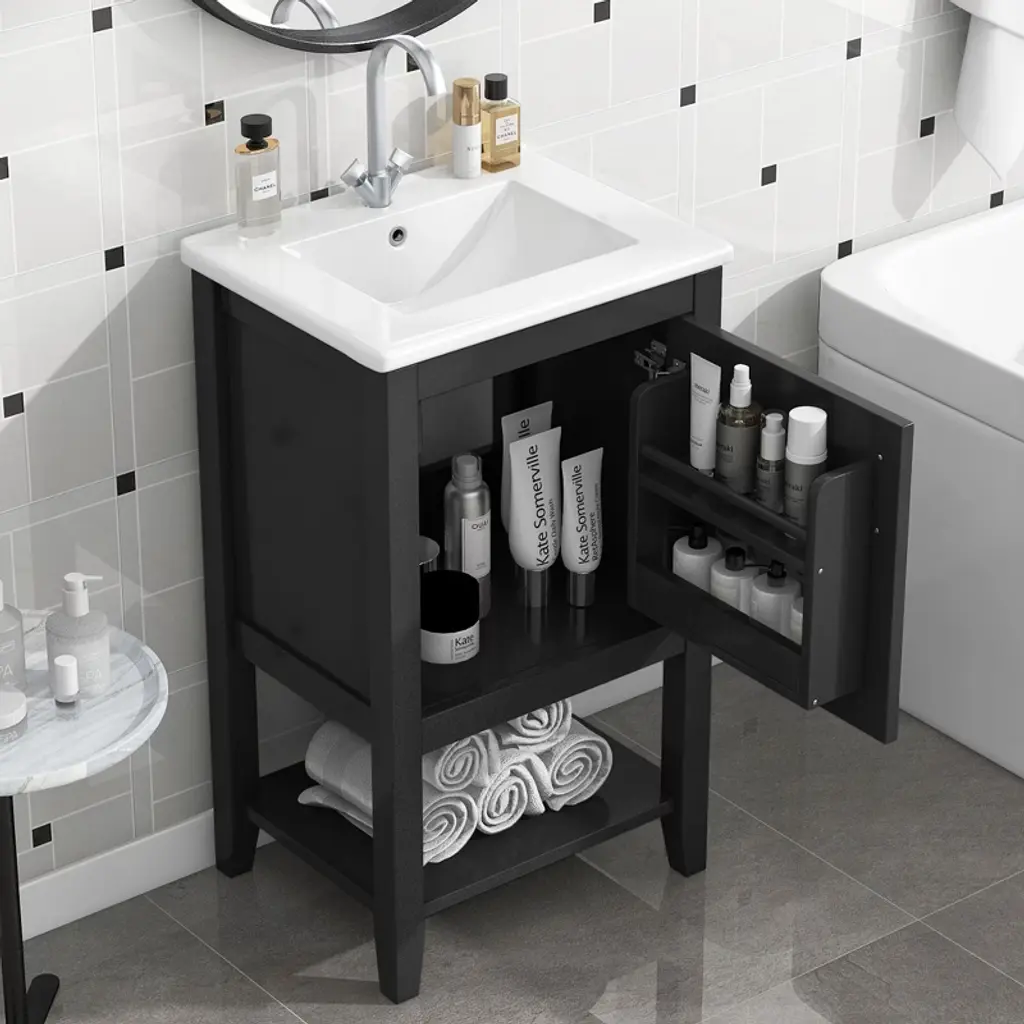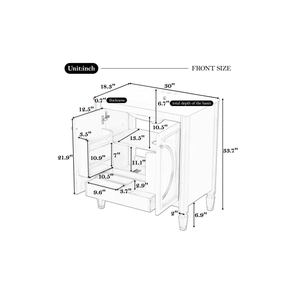 Elevate your Vanity Bathroom with this 30" Freestanding Bathroom Vanity— a perfect blend of vintage charm, durable construction, and versatile storage. As a Bathroom Vanity with Sink, it features a smooth, waterproof solid ceramic sink (resists water stains, easy to clean) with 3 pre-drilled holes (compatible with 4" centerset faucets, faucet not included) and a chrome-finish overflow to prevent spills. Crafted for long-lasting use, it combines a sturdy solid Rubber wood frame with high-quality MDF boards, topped with an easy-to-clean painted finish. Its vintage design shines through protruding door lines, rounded details, and retro tapered legs—adding layering and elegance that complements any decor, upgrading your Vanity Bathroom effortlessly. Designed as a functional Bathroom Storage Cabinet, it offers ample organization: two soft-closing doors (with a 2-tier shelf), one internal drawer (removable panel for custom zones), and an adjustable shelf—keeping soaps, towels, shampoos, and essentials dust-free. Shipped in one package with all hardware and a manual, this Bathroom Vanity takes ~30 minutes for 2 people to assemble; its open-back design ensures easy plumbing access, and rust-resistant metal hinges + gold knobs boost both durability and style.