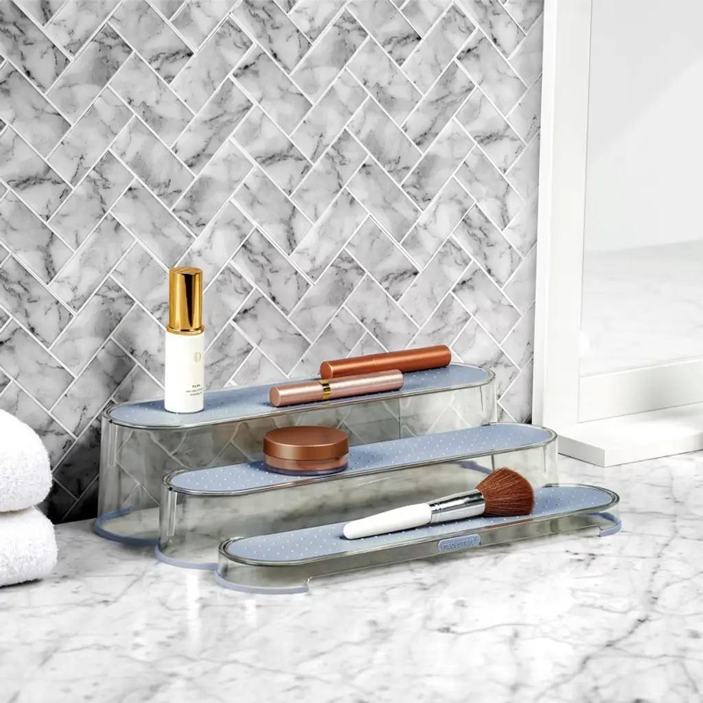 Say goodbye to clutter on countertops, vanities, and shelves with the madesmart Clear Shelf Organizer. Designed to streamline your space, this organizer boasts soft-grip lining on each of its tiers, ensuring that all your essentials stay secure and in order. The base is lined with non-slip material, providing extra stability and peace of mind. Constructed from high-quality, BPA-free plastic, this organizer is not just a practical storage solution but also a commitment to durable, long-lasting organization. Whether it's for beauty products, kitchen spices, or office supplies, the clear design blends seamlessly into any decor, making it an indispensable addition to any home.