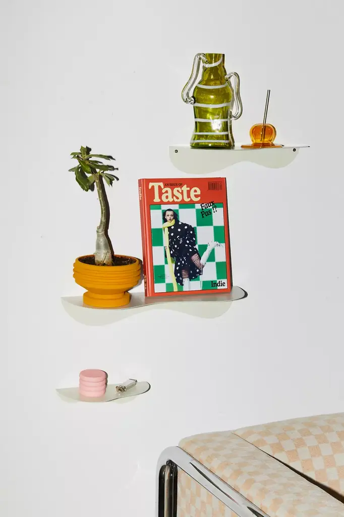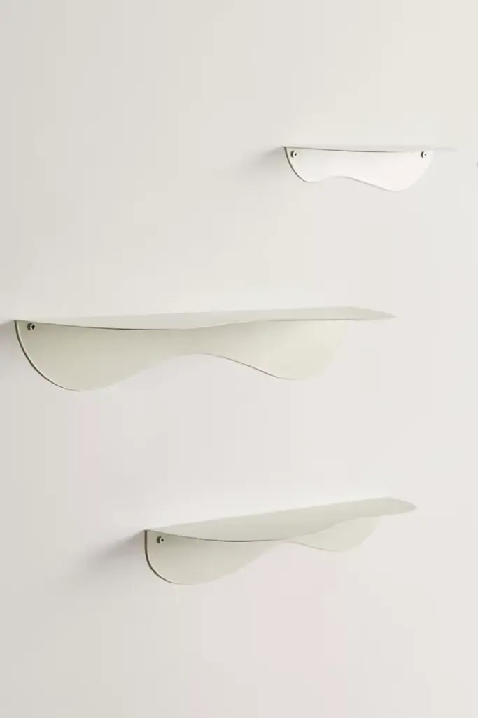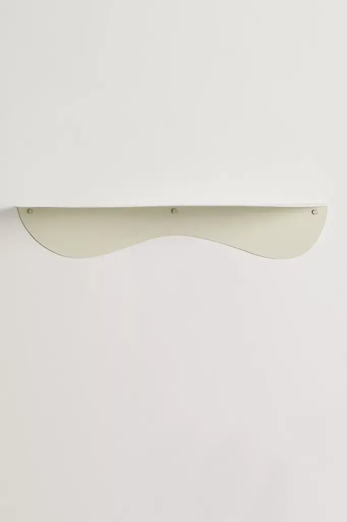 Playful metal wall shelf with a wavy edge that brings an unexpected accent to a sleek profile. Mounts to the wall via a bracket underneath. Available exclusively at Urban Outfitters.