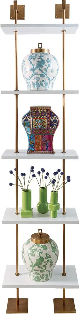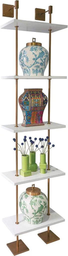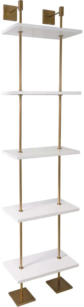 Whether you hang it on a wall or stand it on the floor, this three-shelf unit will bring timeless glamour to a room. The aged brass finish of the supports complements the semigloss white finish of the shelves to perfection.