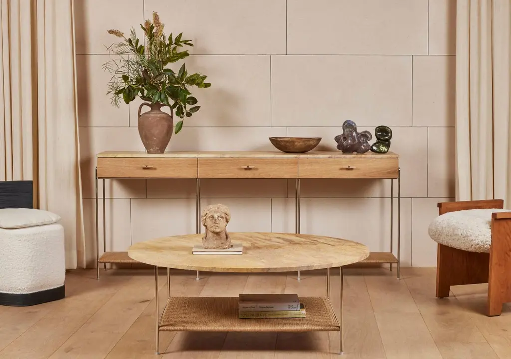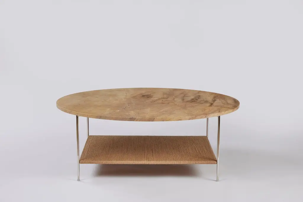 Each marble top is selected for its unique qualities. The rush shelf is woven by a master weaver with over 40 years experience. We use 70% recycled steel for the frame. Designed by a former art dealer who represented contemporary artists for over 30 years including some of the giants of minimalist art. The inspiration the designer took from working with minimalist artists over decades is realized in the principles of simplicity, honesty, utility at the heart of MIlwood Design. Hand made locally in Venice, California.