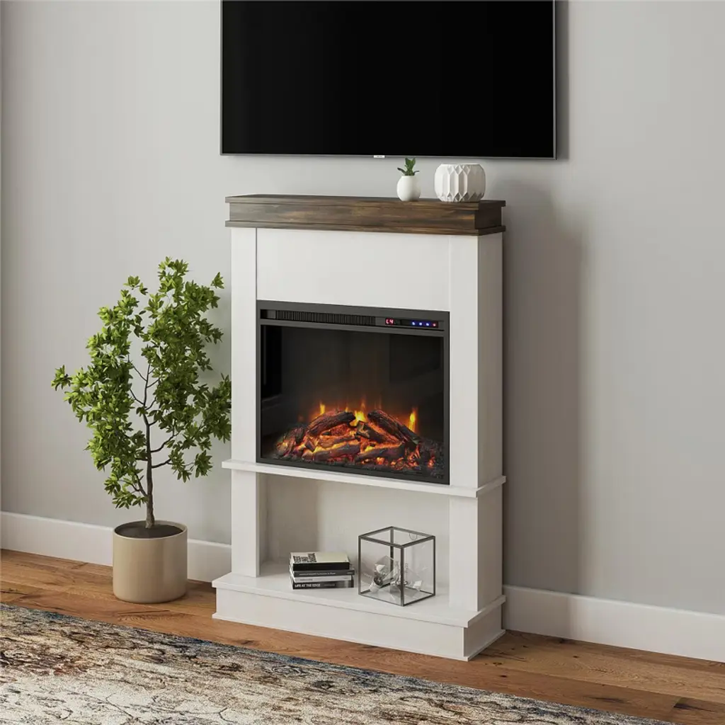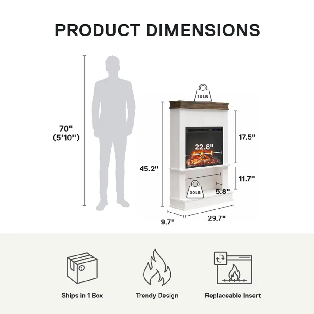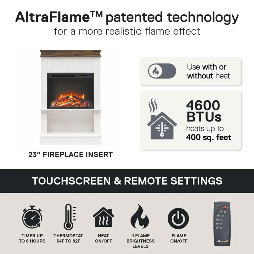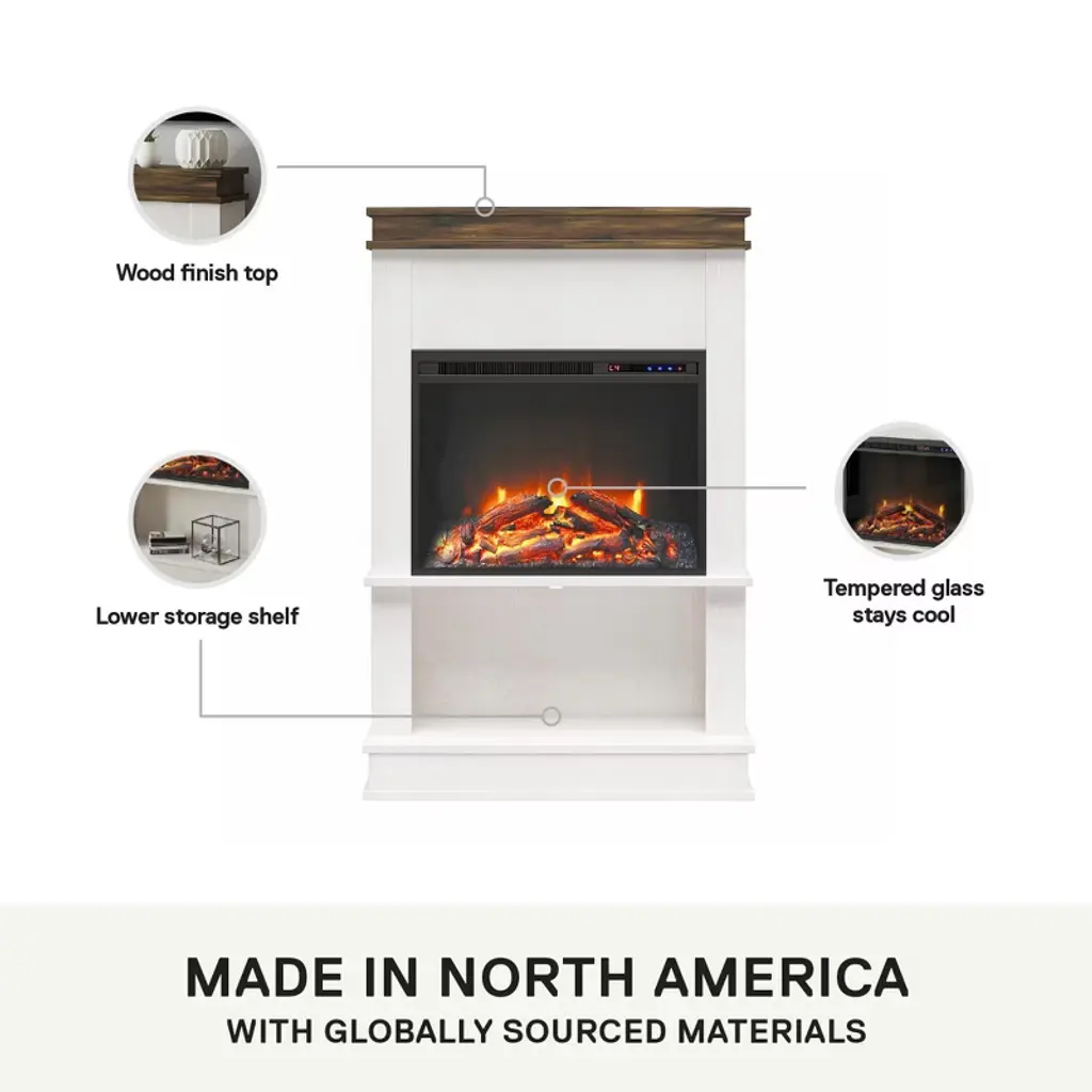 Enjoy the warm and inviting feel of a fire at the push of a button with Ameriwood Home Mateo Fireplace with Mantel and Open Shelf. Adorn with your favorite décor or your beloved family photos atop the beautiful naturally finished mantel, and store books and décor on the lower shelf below. Control the Fireplace flame setting with the included remote control or by the touch panel and choose to enjoy your Fireplace with or without the heat setting while still allowing the flames to give off their calming feel. This 23" fireplace insert is powerful enough to warm a room up to 400 square feet and features an adjustable temperature control and adjustable flame to both create your desired ambiance while keeping your room at the perfect temperature. The Electric Fireplace ships flat to your door and requires assembly. Two adults are recommended to assemble and move. Once assembled, the Fireplace measures to be 29.69" W x 9.72" D x 45.24" H.