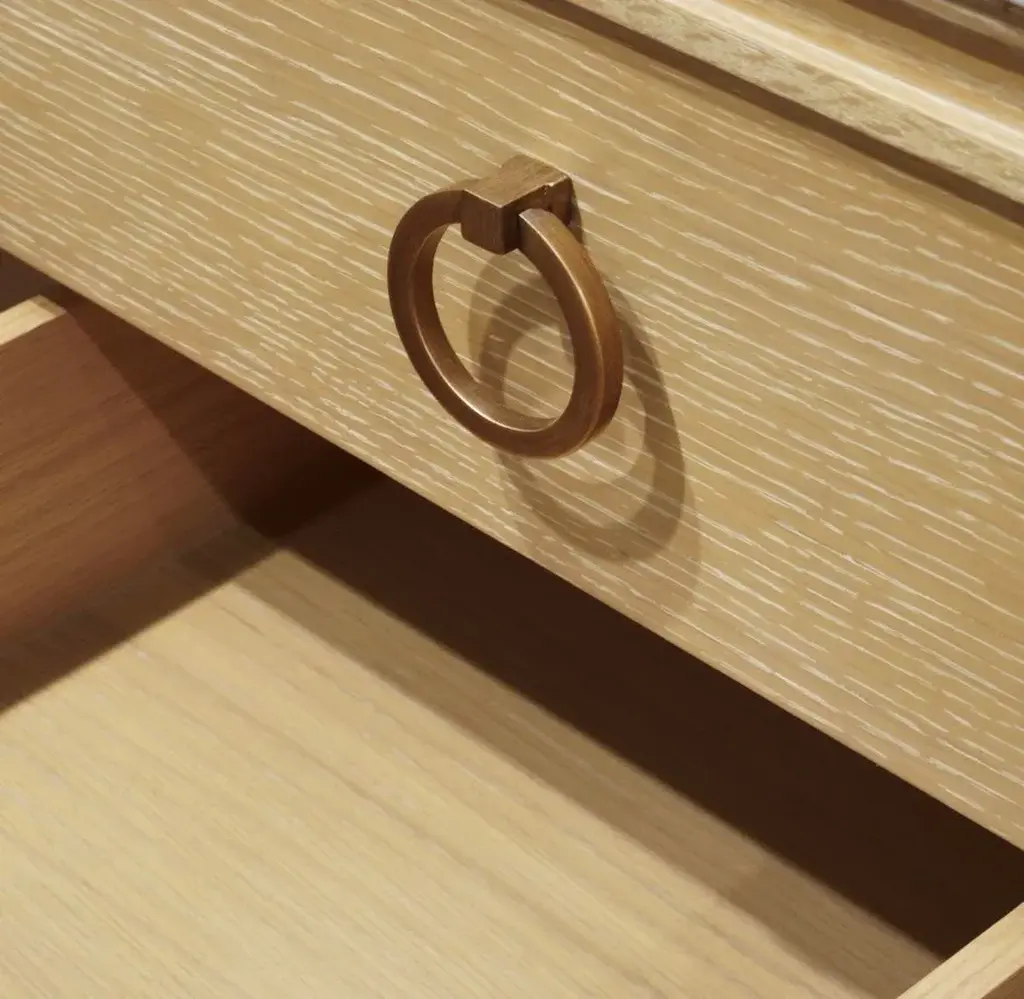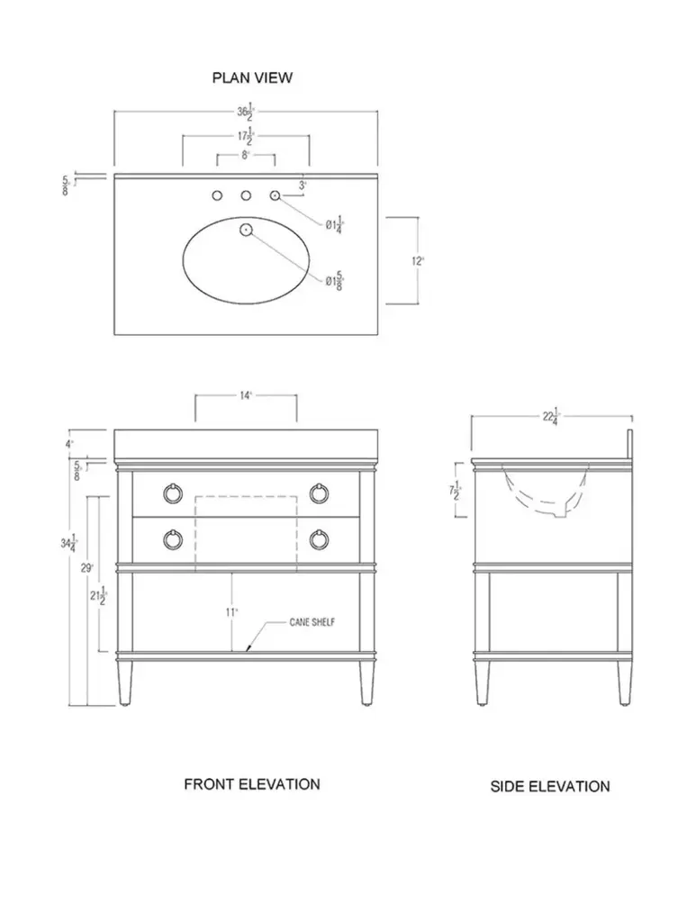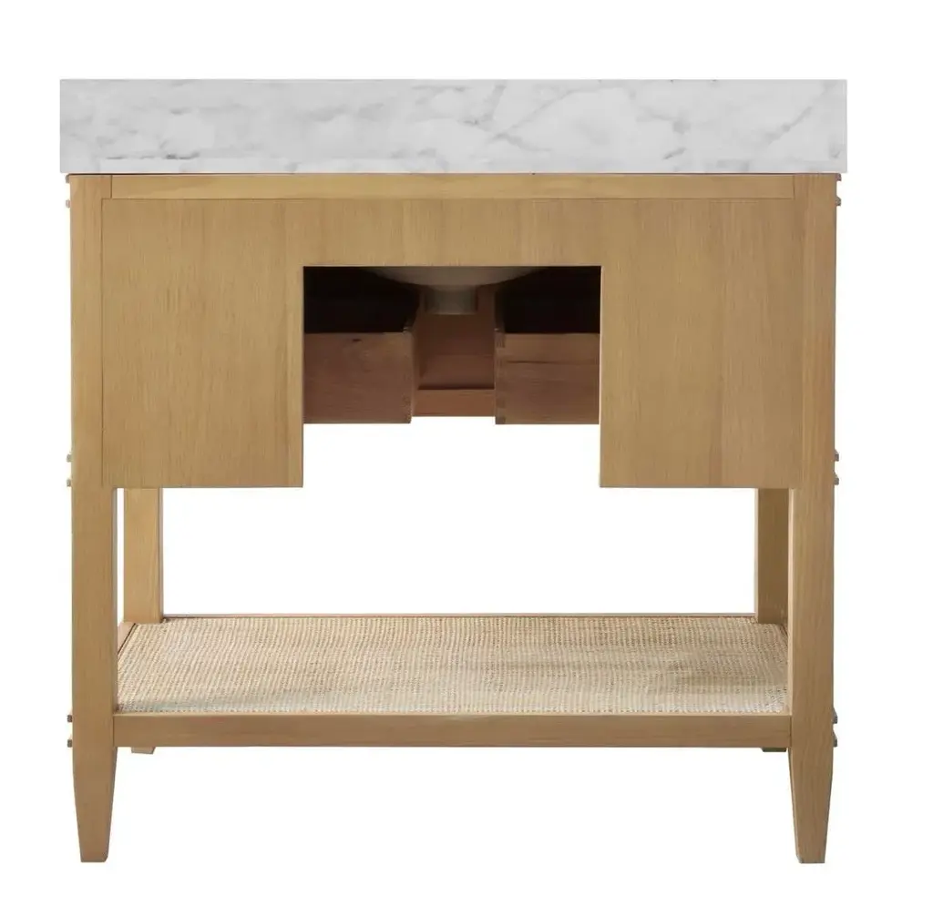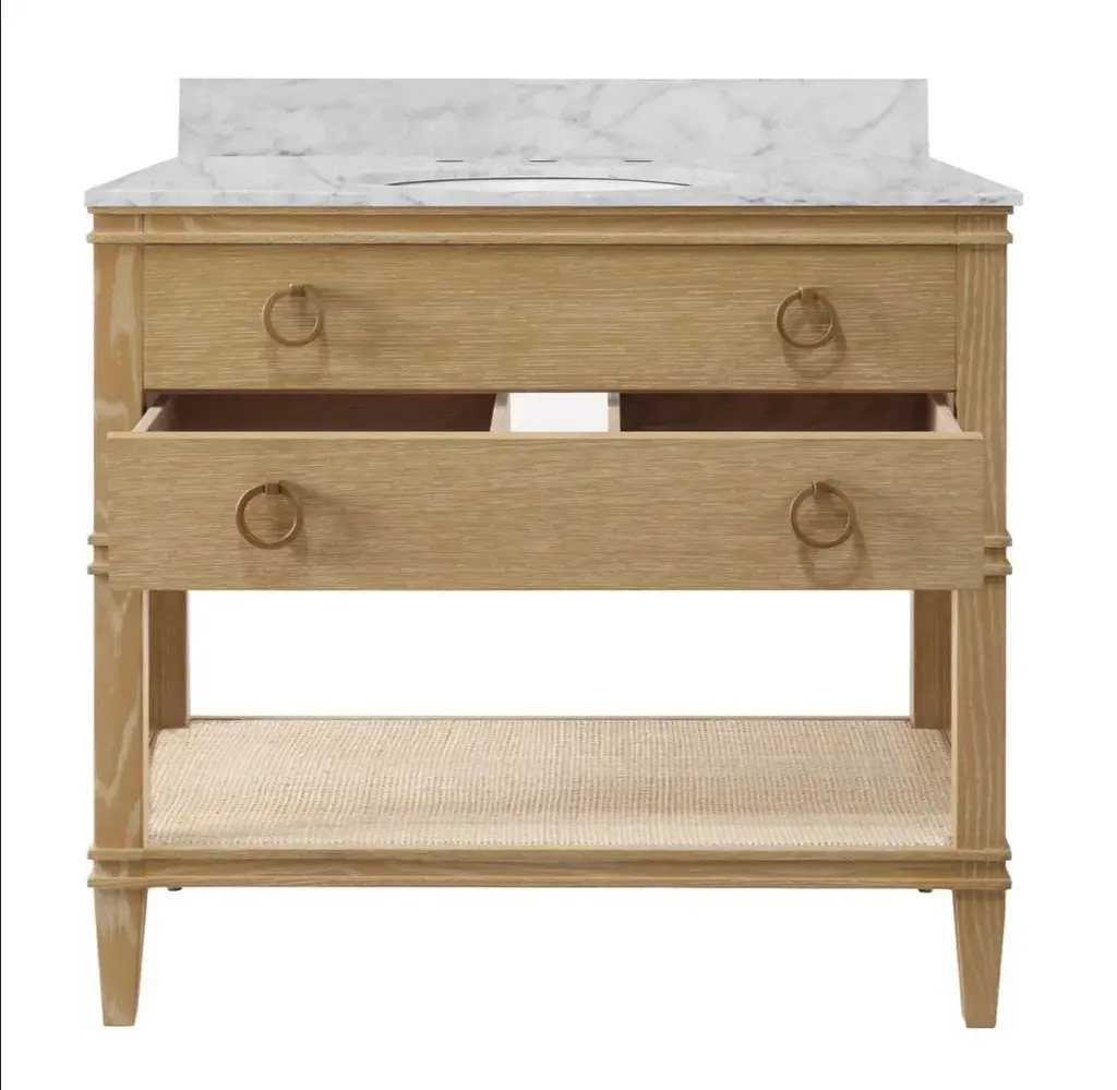 The Cutler cerused oak bath vanity is a celebration of craftsmanship and natural beauty. Its emphasis on a seamless user experience is enhanced by the incorporation of soft-close glides and antique brass ring hardware. Finished in a timeless cerused oak, the vanity showcases handwoven cane shelf, white with grey accents Carrara marble top, and porcelain sink. Backsplash is 4" High, Full width of product. Included but not attached. For use with 8" widespread faucet (not included). *Wood & rattan have natural variations and may differ slightly between panels. Dimensions: 36.5" W X 34.875" H X 22.25" D