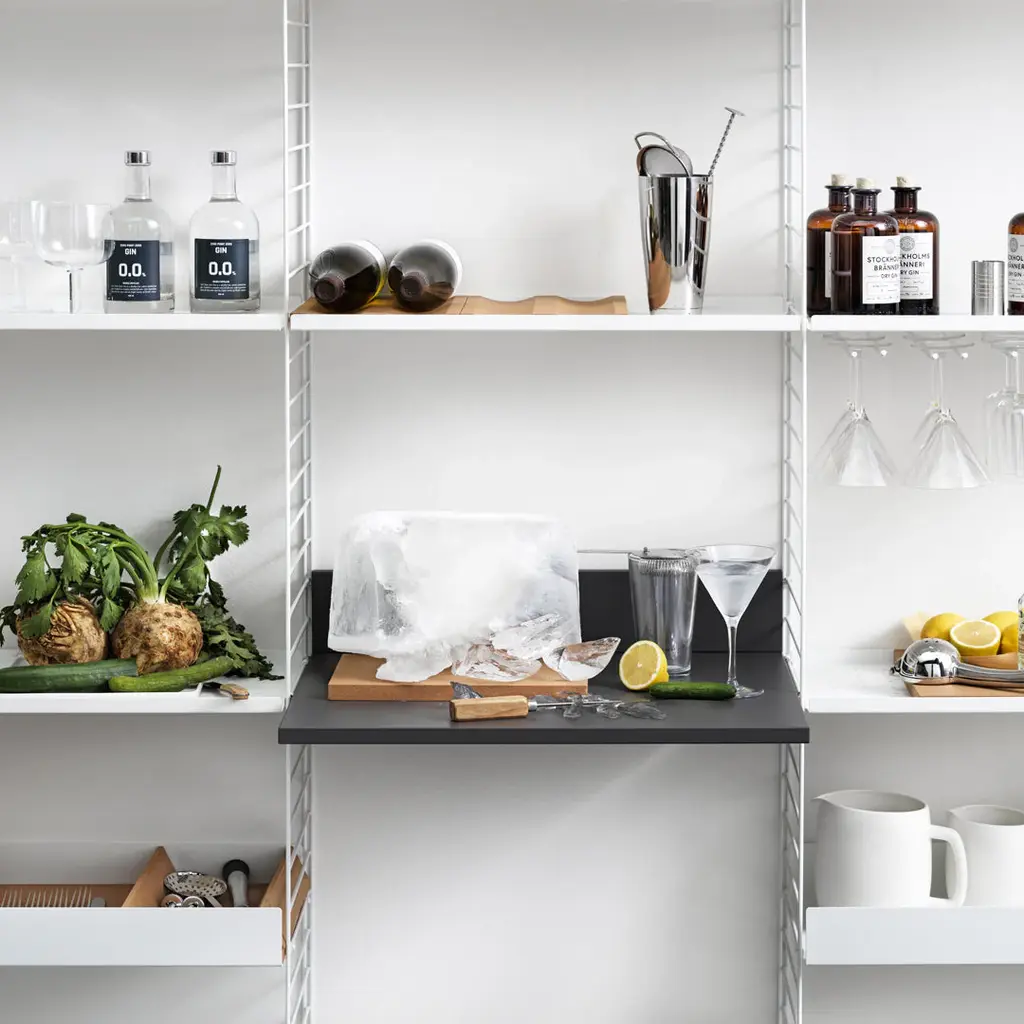 The media shelf is available in one size, b58 x d47 x h10 cm and fits into wire panels from String® System with depth 30 cm. The media shelf is produced to give the vinyl record player a designated spot. The media shelf is designed to help you organize all cords and cables by letting them disappear behind the shelf without the risk of getting pinched between the wall and shelf. The media shelf can easily be turned into a workspace, or why not a drink table. Each packaging contains one media shelf, one ledge to place against the wall to stabilize the media shelf along with brackets.