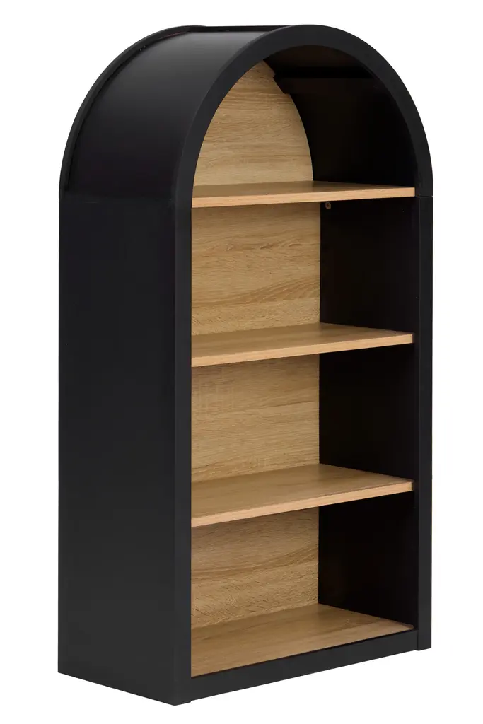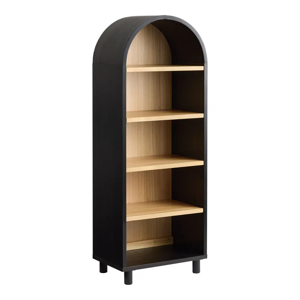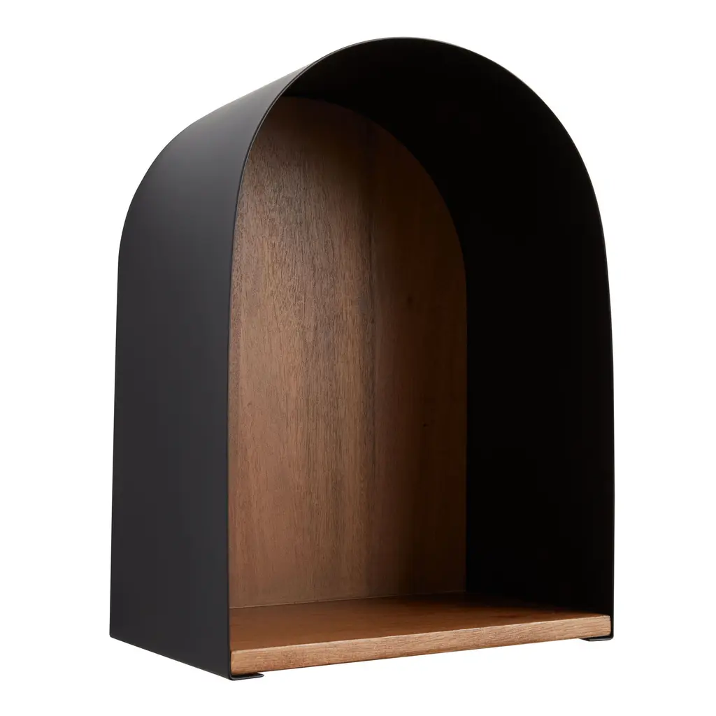 Create a personalized diorama or altar with our arched, floating wall shelf crafted of iron with black finish and acacia veneer. Its deep black arch and warm wood shelf and backing make an inviting setting for candles, photo frames and dried flowers. Hang it in your bedroom or bathroom for an intimate display or place it in living spaces as a unique showcase.
