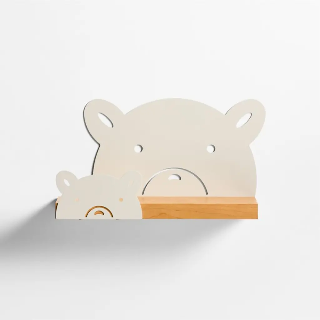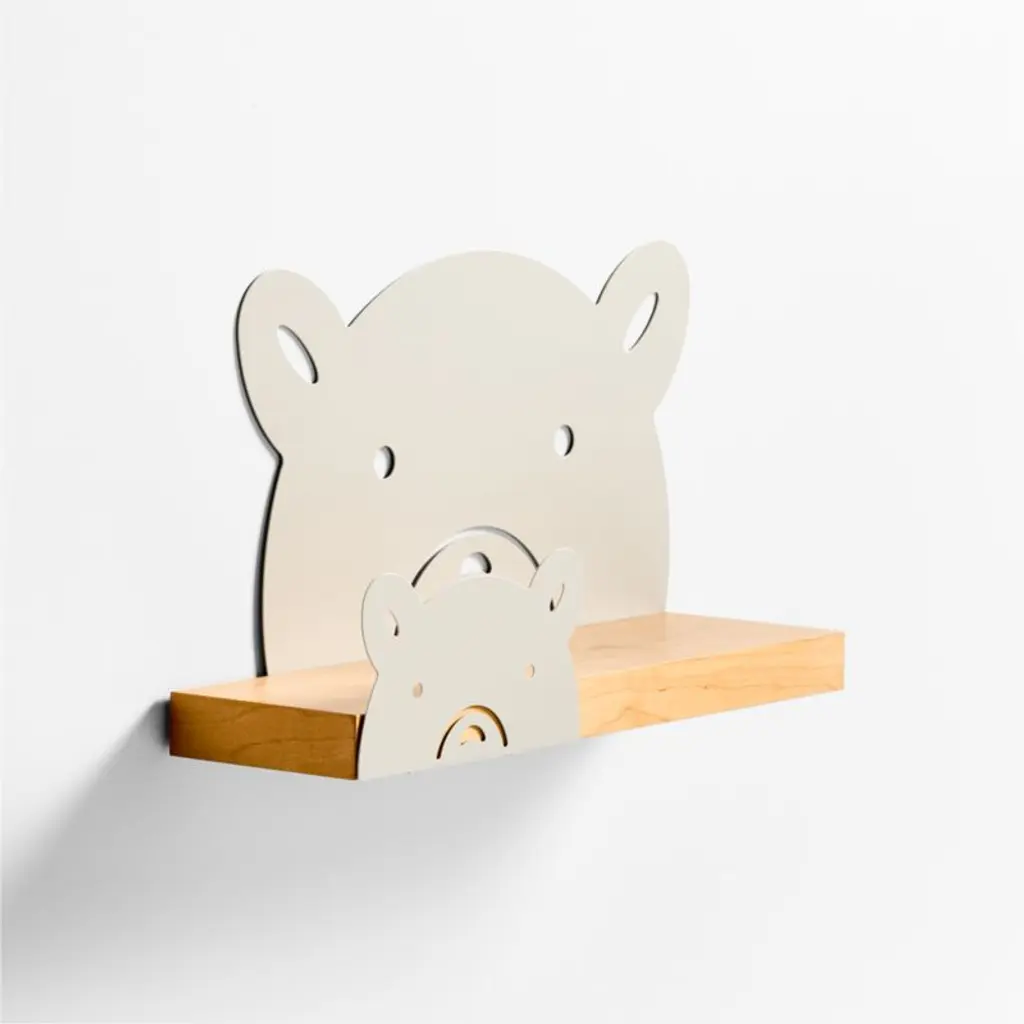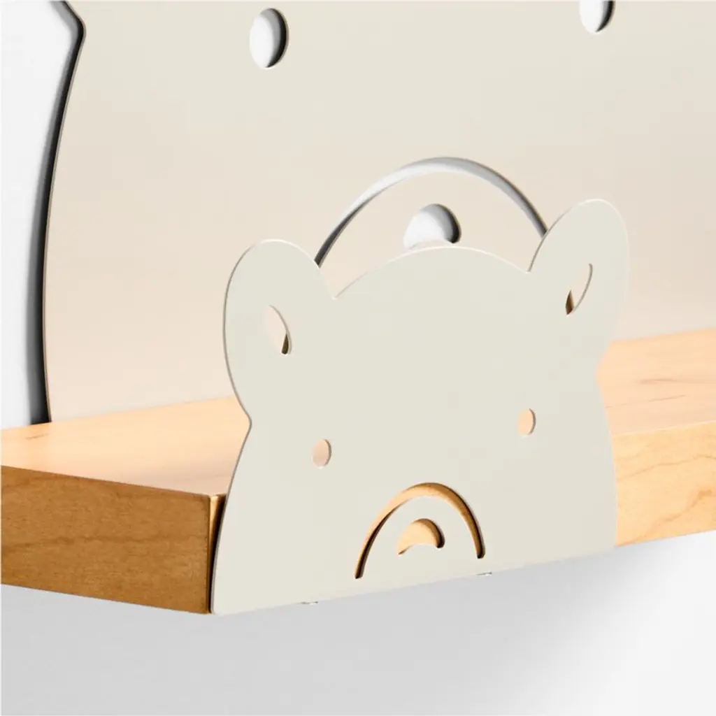 Bring cheery vibes and extra storage space to your kid's bedroom, craft space or nursery with our Metal and Wood Bear Wall Shelf. Each laser-cut silhouette sports rounded ears and a sweet expression, all in a cozy grey powdercoat finish that blends seamlessly with any decor. Use it to display books, toys and other favorite treasures.