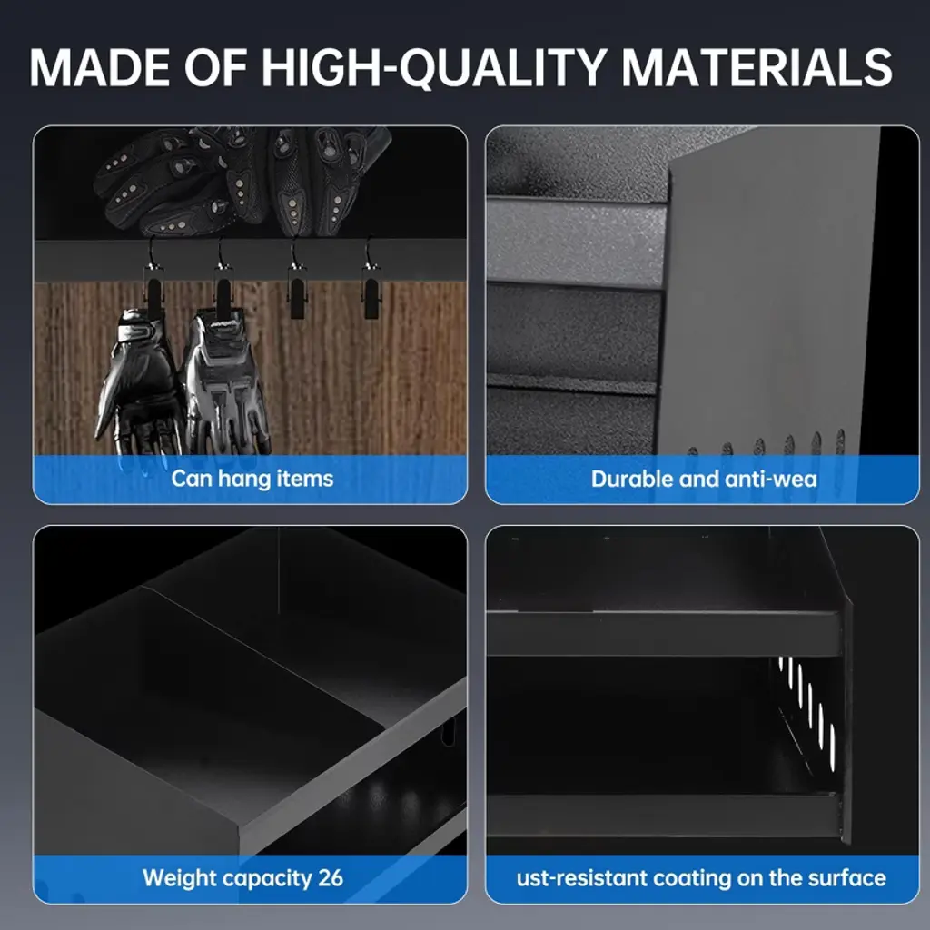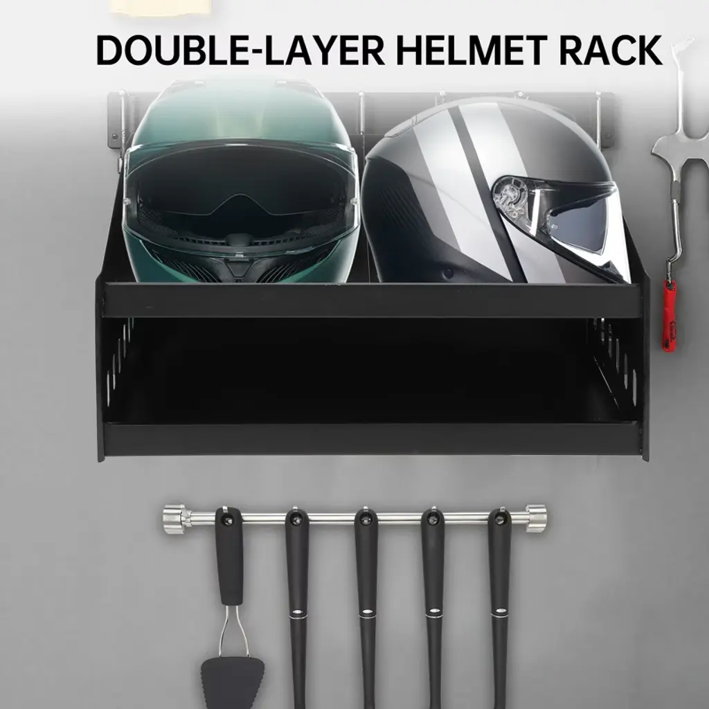 Aluminium Helmet Tray The wall mounted aluminum helmet tray is perfect for showcasing your helmet! This lightweight and space saving design is made of high-quality aluminum, which is durable and can safely store helmets. You can also hang cycling clothes and gloves on the side to maximize the use of your space. Product Highlights • Dual helmet capacity for versatile storage • Integrated shelf for goggles, gloves, and accessories • Ideal for garages, trailers, and workshops • Durable aluminum structure, rust proof • Easy to install, firmly attached to the wall