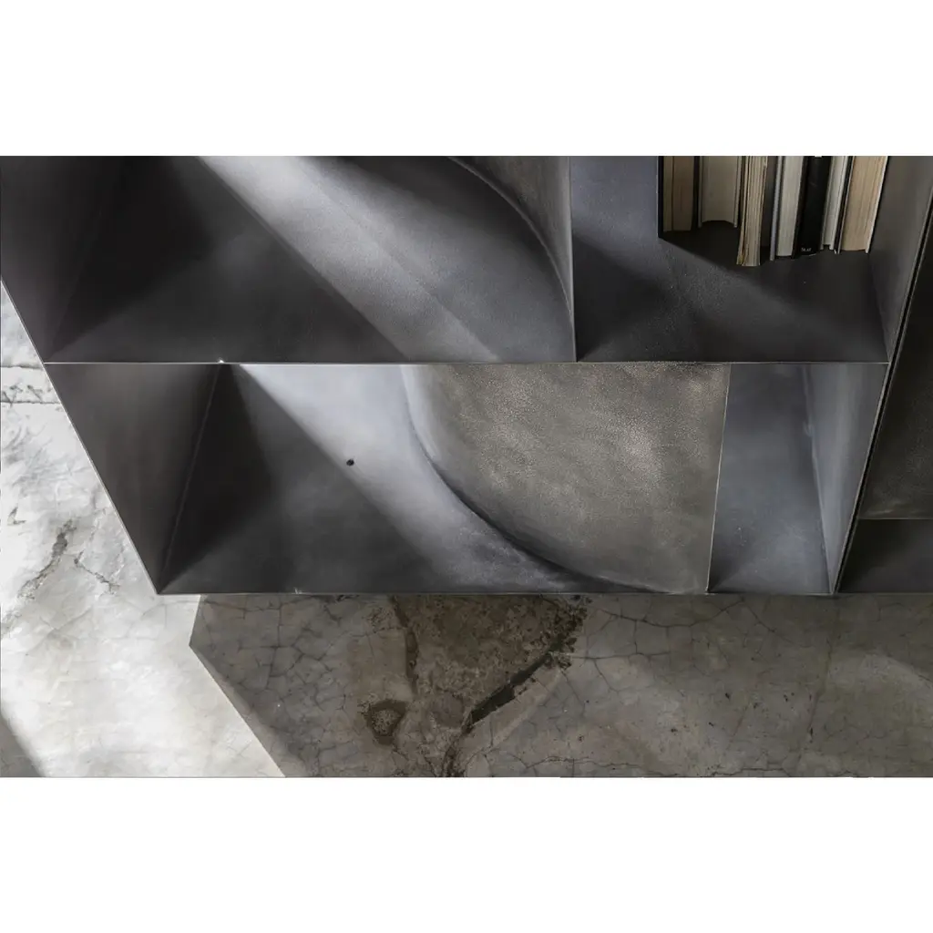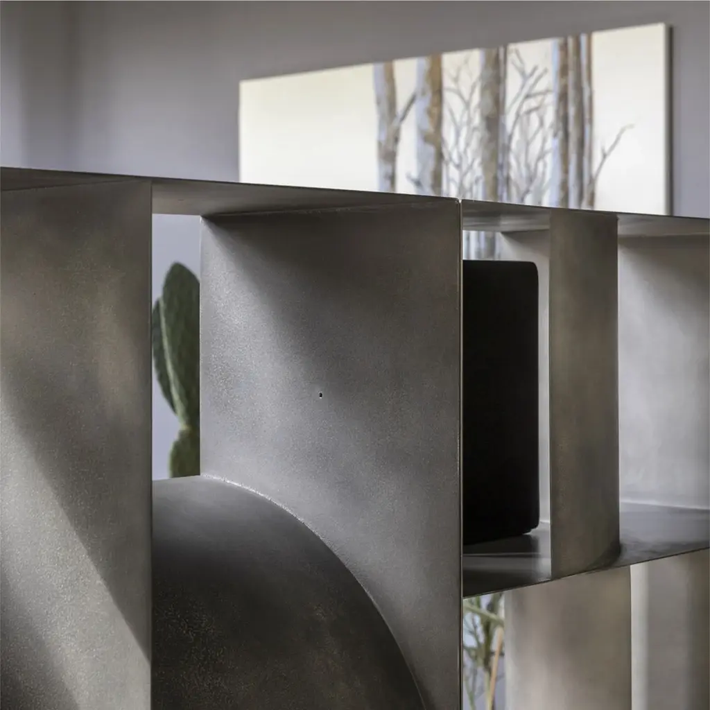 Introducing the Metal Module Floor Shelf by Mogg Judd, a functional and elegant addition to any space. Featuring concave and convex curves, this versatile container can be used as a divider or to organize and decorate your home. Available in two finishes and sizes, it offers infinite compositions for a dynamic and sculptural touch.