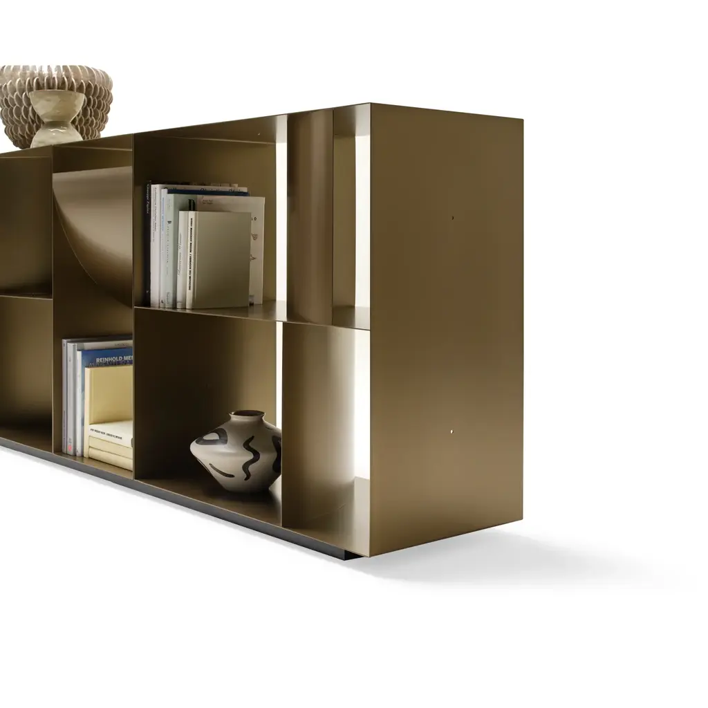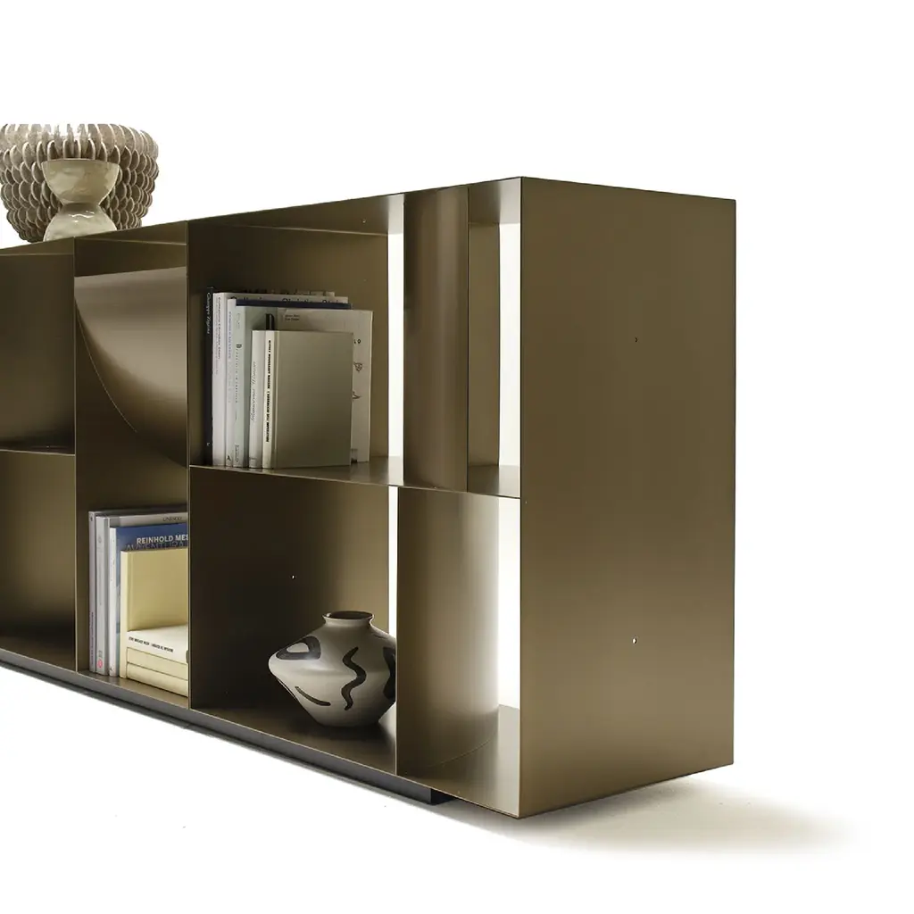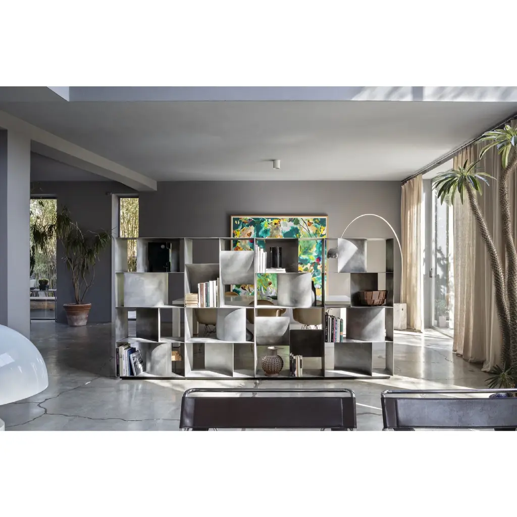 Introducing the Metal Module Floor Shelf by Mogg Judd, a functional and elegant addition to any space. Featuring concave and convex curves, this versatile container can be used as a divider or to organize and decorate your home. Available in two finishes and sizes, it offers infinite compositions for a dynamic and sculptural touch.