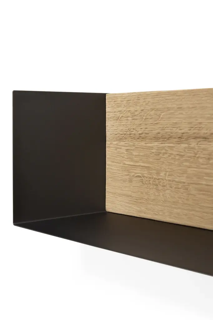 The Minimalist Oak Wall Shelf boasts a silhouette that gracefully traces the wall, resembling a slender, sharp line. The Ethnicraft U shelf's back, crafted with solid oak, allows an easy and secure wall mounting, complemented by the delicate fusion of slim metal elements, resulting in a high-quality and long-lasting product. Its concealed wall fixing lends a clean and refreshing quality to the shelf, making it appear delightfully airy.