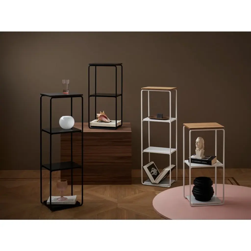 Maze's Mixrack floor shelf L, designed by Tapio Anttila, features four shelves placed on a metal wire frame. The oak veneer on the top shelf gives a nice organic touch to the otherwise industrial design. This minimalistic and versatile freestanding floor shelf is suitable for various uses – you can use it, for example, as a nightstand, plant stand or side table in a room of your choice. You can also place several Mixrack shelves in a row or pair the shelf with other members of the Mixrack collection.