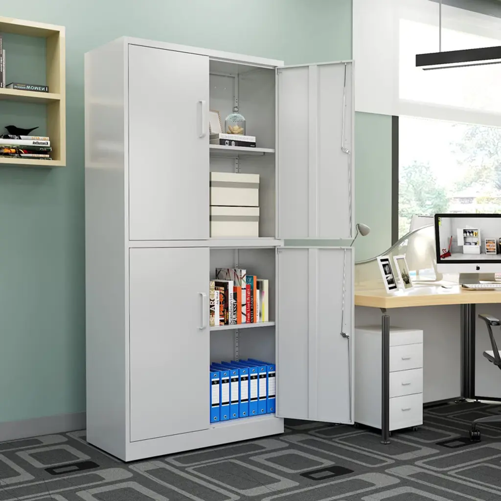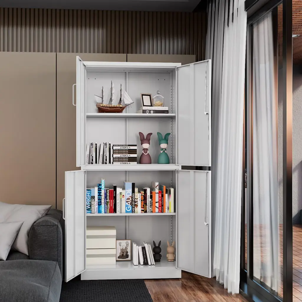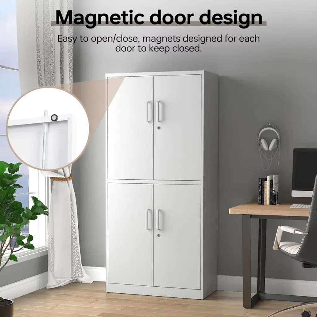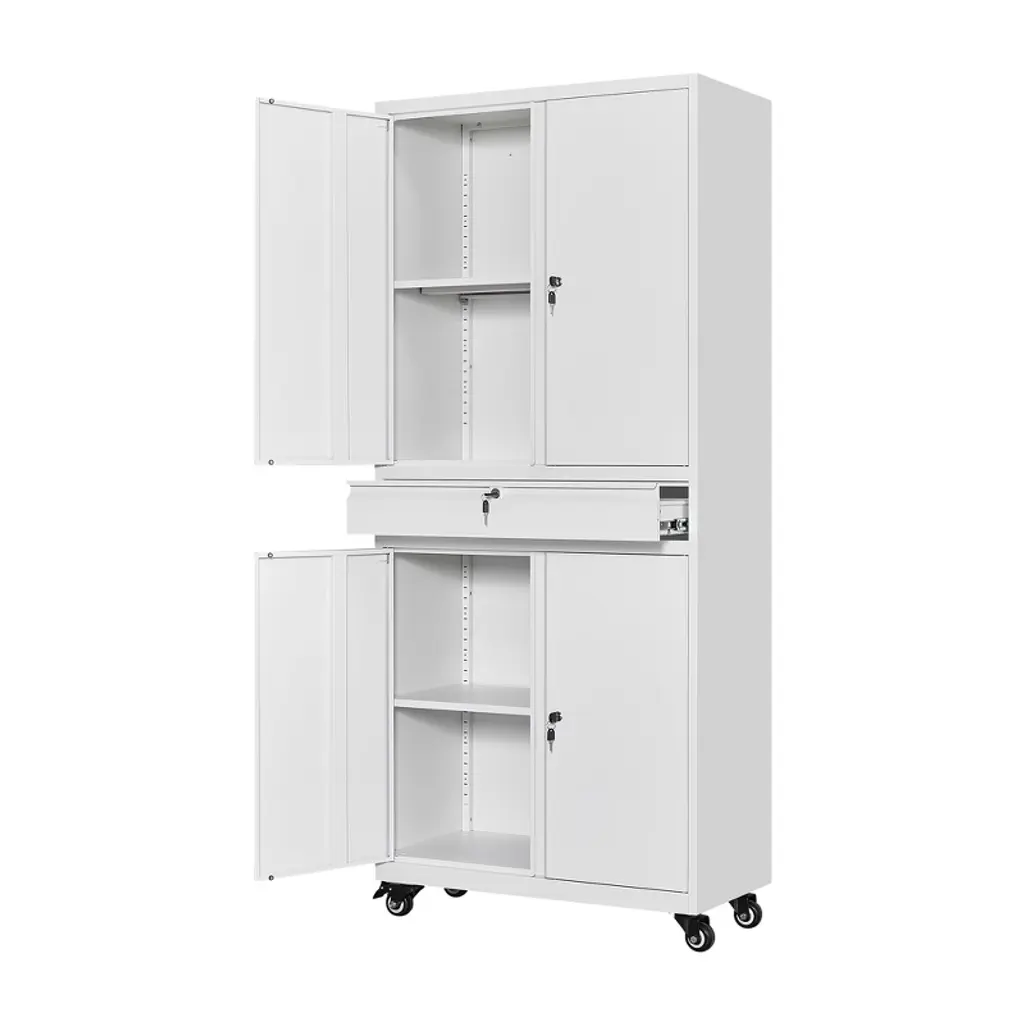 Mlezan 4-door Storage Cabinet: White Metal, Adjustable Shelf, Lockable. Ideal For Office, Home, Pantry, Kitchen, Or Garage. Secure And Functional.