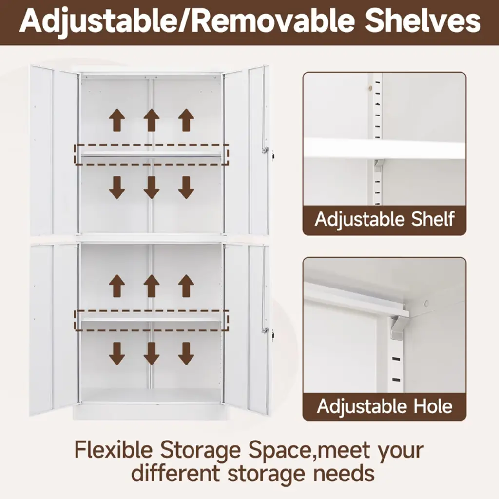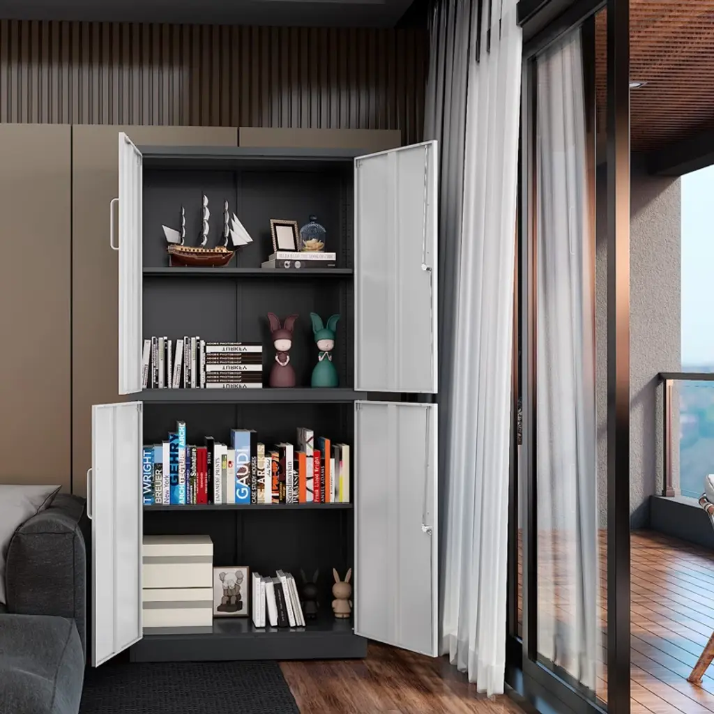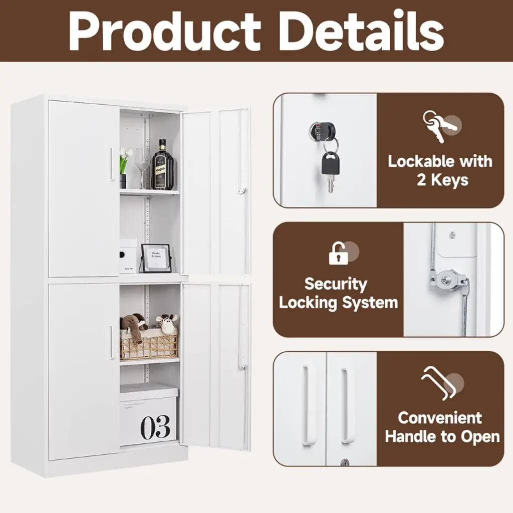 "Secure & Spacious Storage: Mlezan’s heavy-duty steel cabinet features a 3-point lock system, adjustable shelves, and wall-mounting for added safety. Perfect for offices, garages, or homes, it’s built to last with rust-resistant coating. Easy to assemble – your reliable organization solution!"