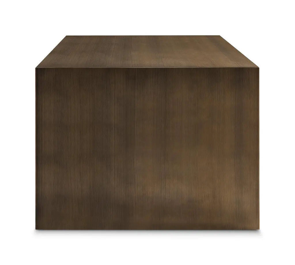 Modern Bronze End Table with Shelf designed by Greg Sheres. The "Piero" side table is a beautifully scaled simple rectangular form. Both horizontal surfaces are usable for storage or display. The material is stainless steel with a hand applied antique oiled Bronze finish that gives this table a handsome ageless quality. This is a modernist masterpiece of refined simple form with maximized function. The Antique bronze finish makes this table a beautiful addition to any interior. Award winning furniture designer; Greg Sheres, has been designing timeless classics for over 30 years. His pieces are collected and even sold at auctions. All of his furniture is hand made and hand finished. Maintenance: lightly dust or clean with any clear coat car polish and a soft cloth. Avoid paper towels and abrasive cleansers or chemicals.